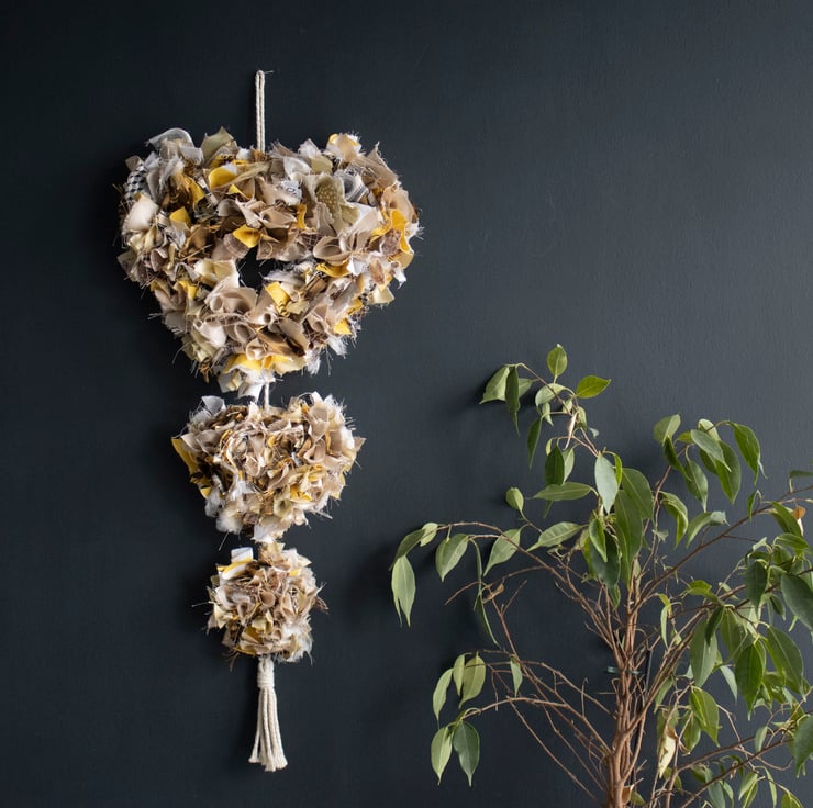 Add a touch of handmade charm to your space with this Golden Hanging Rag Rug Heart Wreath!