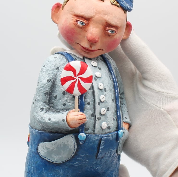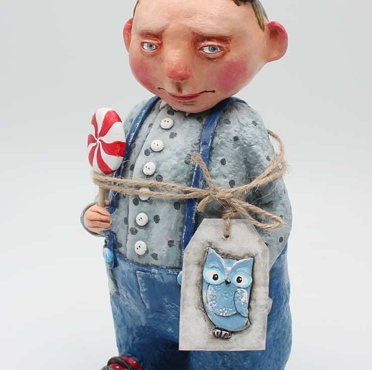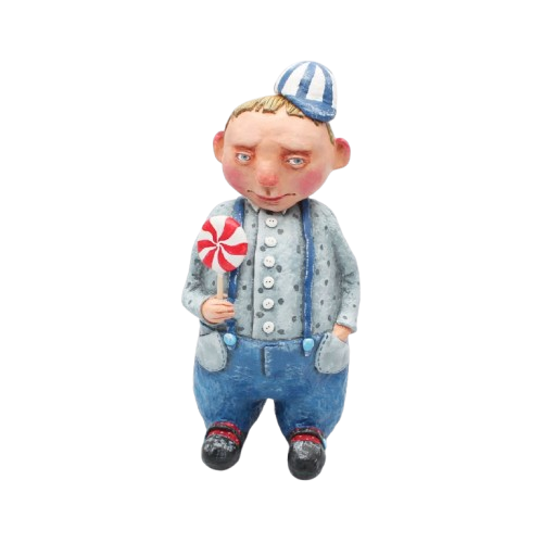Meet Oliver, a charming handmade boy doll crafted from paper clay. Dressed in a blue and white polka dot shirt, blue overalls, and a matching striped hat, he holds a red and white lollipop, adding a touch of whimsy to his appearance. His head is movable, allowing for expressive poses. This unique piece is perfect for collectors and those seeking a special touch in their home decor.