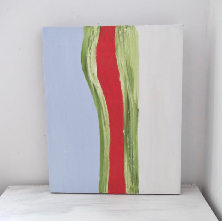 Original abstract oil painting. White, green abstract textured strips, deep orange and sky blue colours.