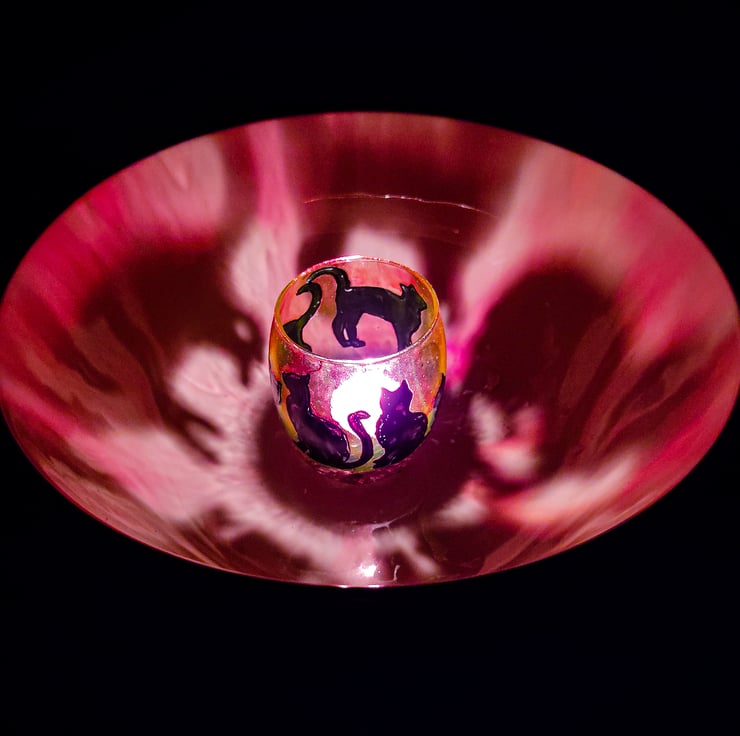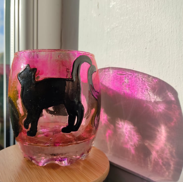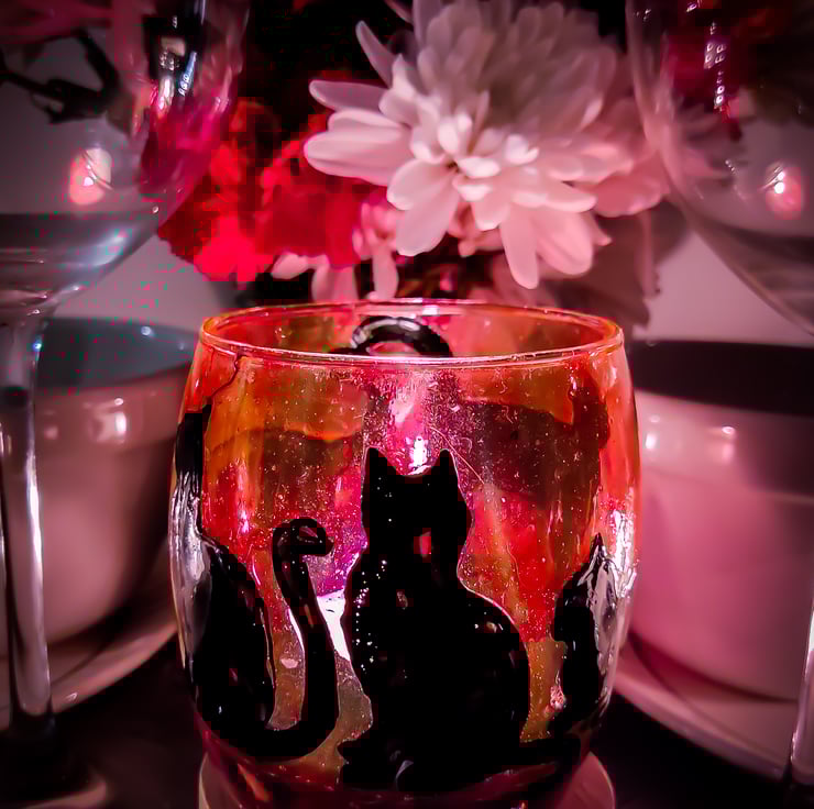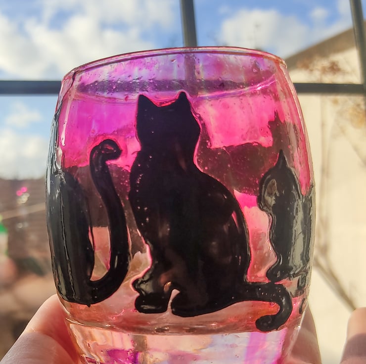 It's painted on a barrel tumble glass and covered with transparent varnish for protection. It depicts black opaque silhouettes of sitting, laying and playing cat on a transparent background. I made three of those candleholders, this one is violet-purple, in the colour of hydrangea flowers or a rose,