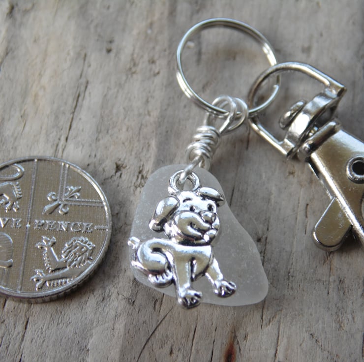 A lovely piece of white Cornish sea glass with a silver coloured dog charm, wrapped in silver plated wire, on a silver coloured split ring and clip.