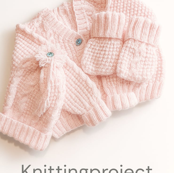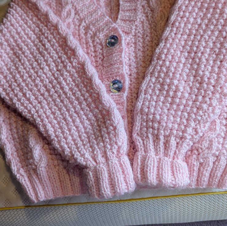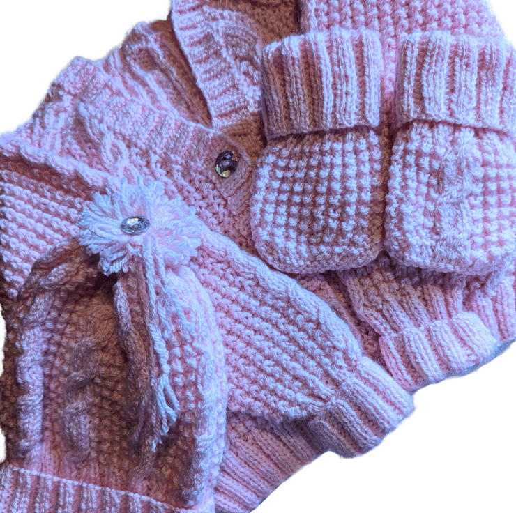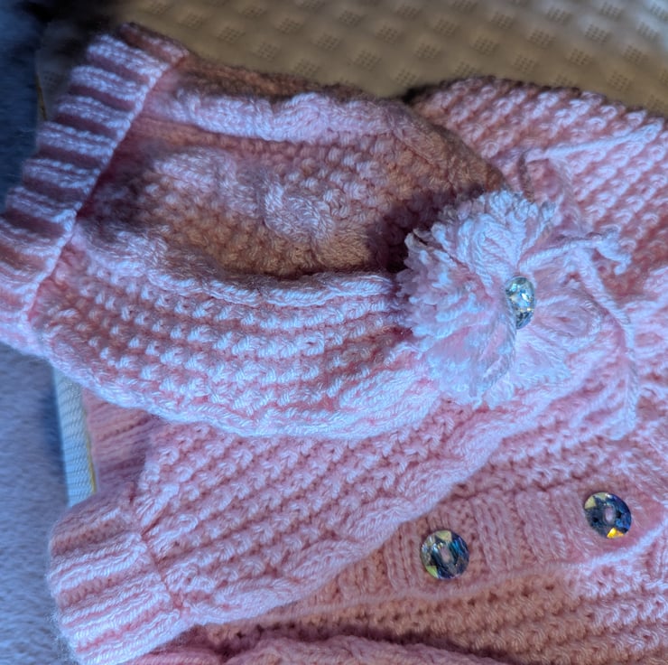 Beautifully knitted set for a baby girl, christening, wedding, birthday party. Stunning pink of pinks acrylic machine washable cardigan and mittens. Hat is a little more delicate and hand wash would be recommended.