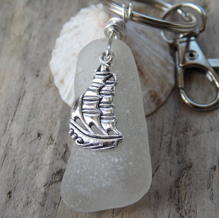 A lovely, chunky piece of white Cornish sea glass with a silver coloured sailing ship charm, wrapped in silver plated wire, on a silver coloured split ring and clip.