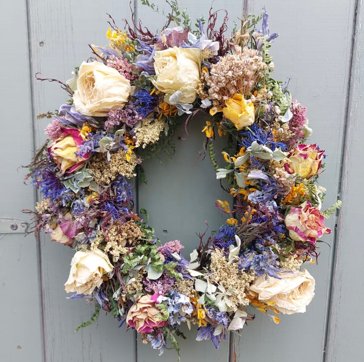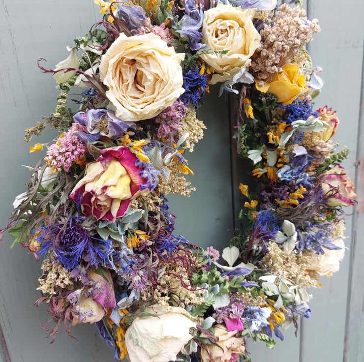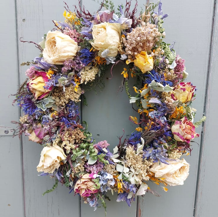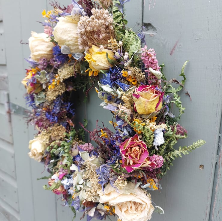 A handmade dried flower wreath measuring approximately 28cm in diameter.