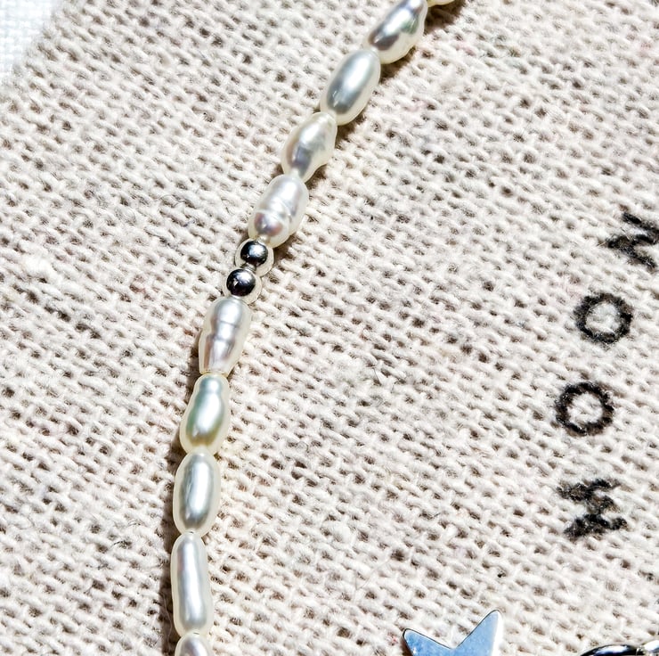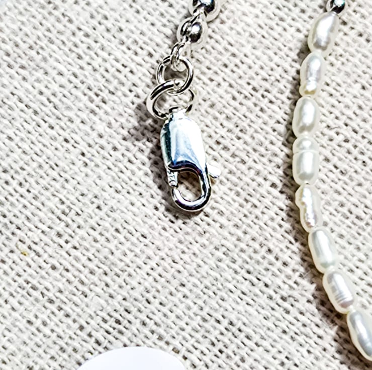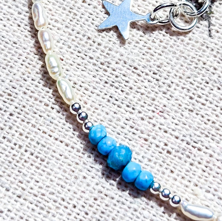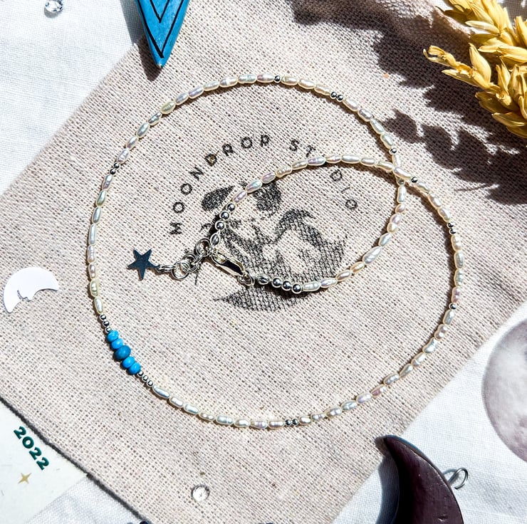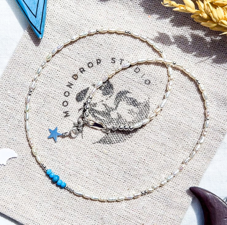 This dainty necklace is made with high-nacre freshwater micro rice pearls, beautiful deep blue faceted Turquoise gemstones, and sterling silver components.