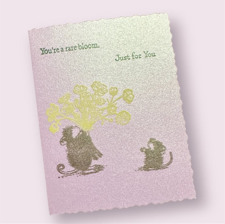 Pack of 2, Blank cards for any occasion, mice and flower bouquet, mauve