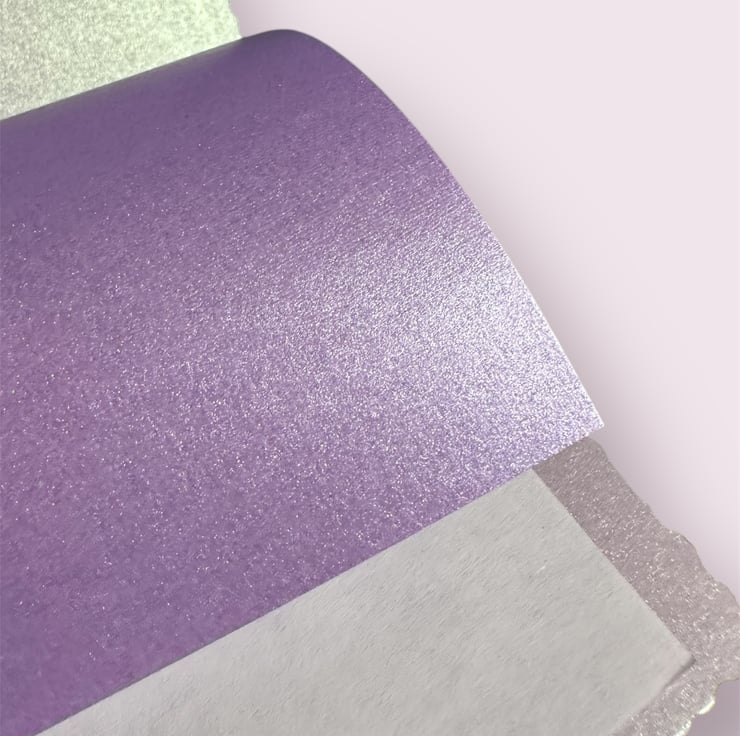 A touch of luxury, each bouquet is done with a thick pearlescent ink and each has an inner layer of fine paper in lilac which is pearlescent on one side to finish off the elegance of these simple but effective cards suitable for a host of occasions.