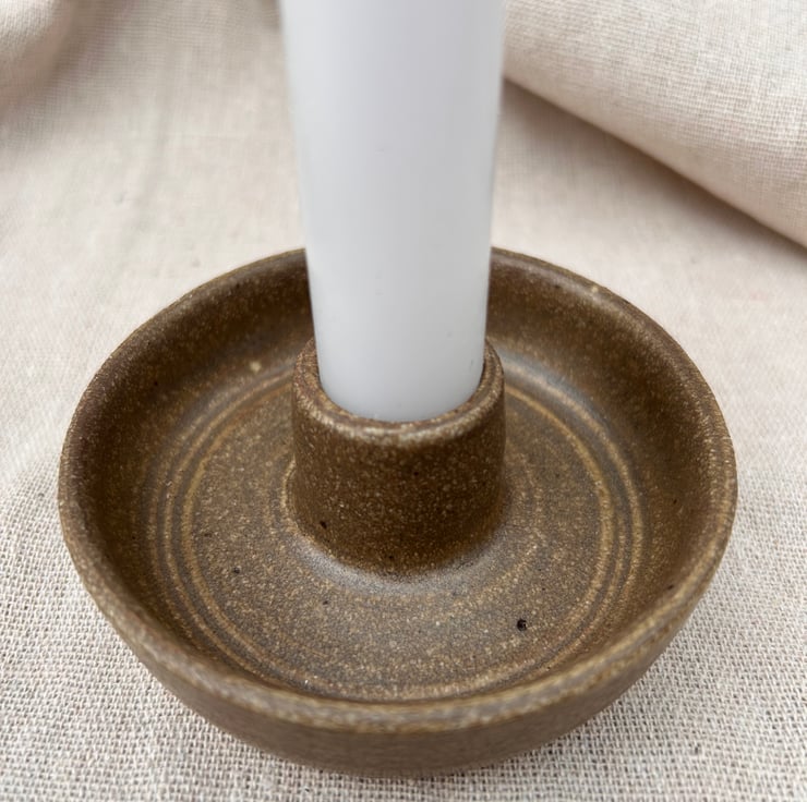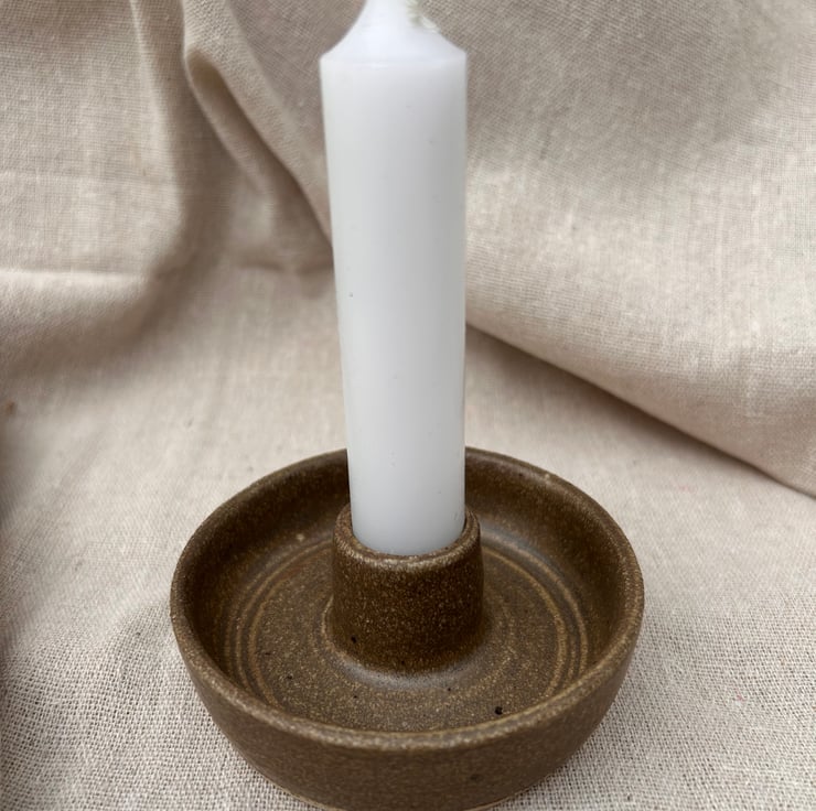 “Handcrafted stoneware candle holder with a rich leather brown glaze—earthy, durable, and perfect for adding warmth to any space.”