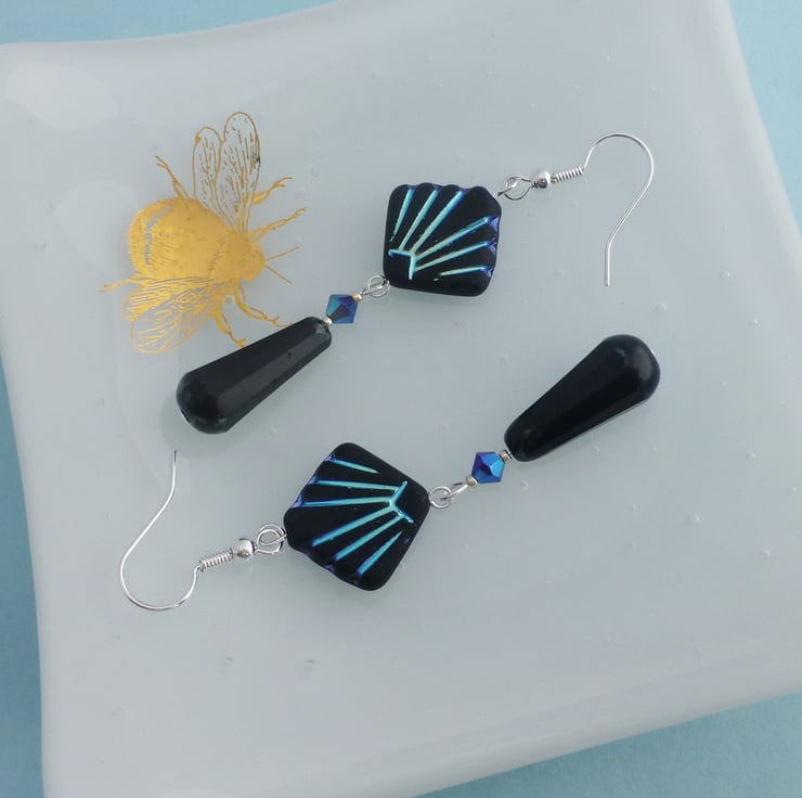 These long Art Deco inspired black and metallic blue drop earrings are approximately 5cm long not including the earwires.