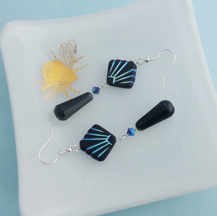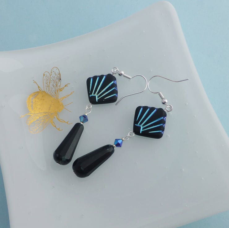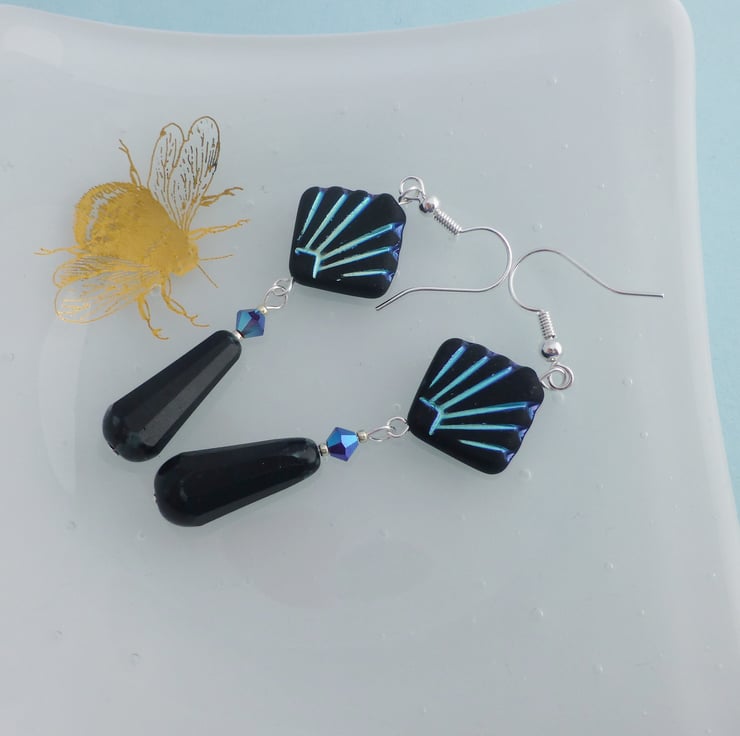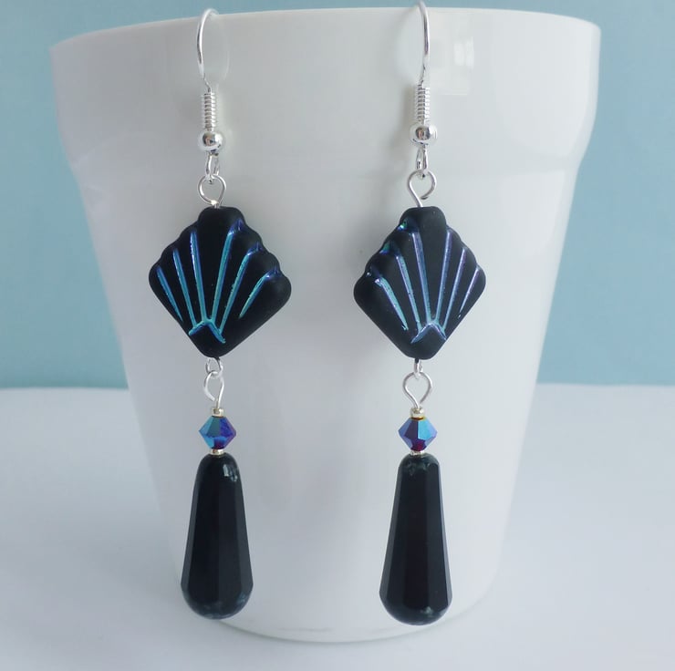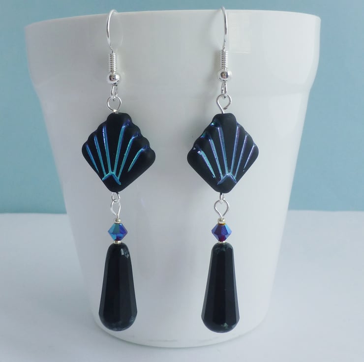 They feature an art deco fan motif, and long black glass drops and are finished with metallic blue crystal beads.