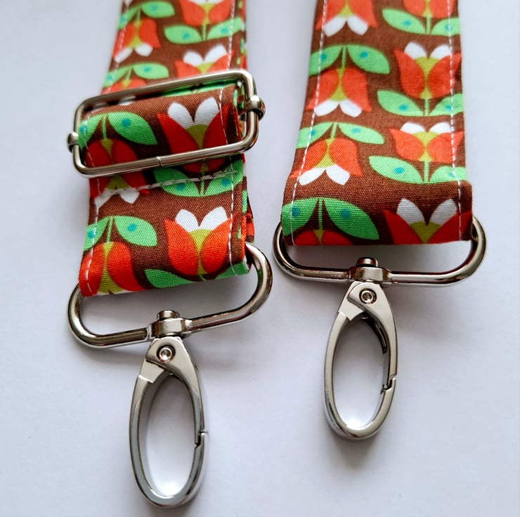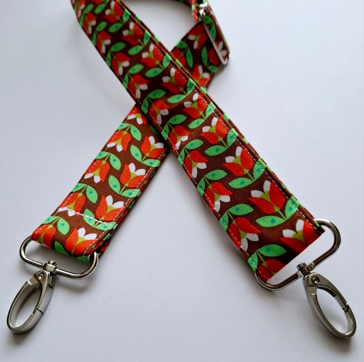 This retro style patterned handbag strap was created with 100% cotton fabric and interfacing added for extra strength and comfort. The colours are brown background with orange, green and white. The silver metal hardware gives the strap a good visual effect. The strap length is fully adjustable from 69cm to 134cm (27" to 53").