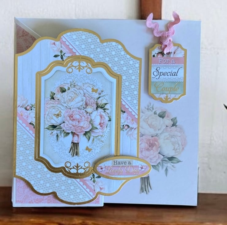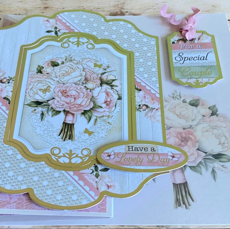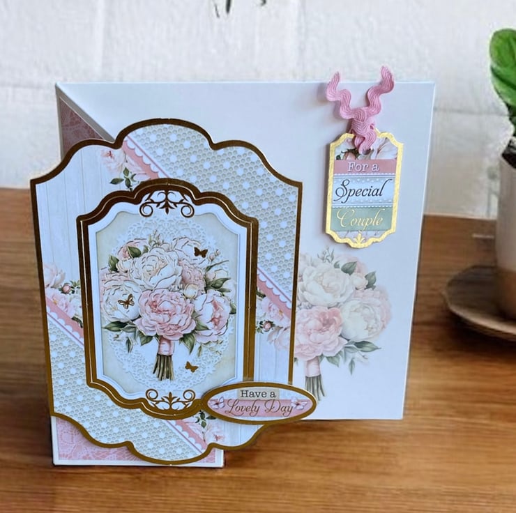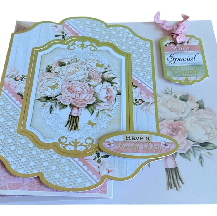 This pretty pastel card features an angled zigzag front detail with a large gold foiled topper with a bouquet of peonies. The inside of the card has been decorated with coordinating paper. The words For a Special Couple and Have a Lovely Day have been added in 3D.