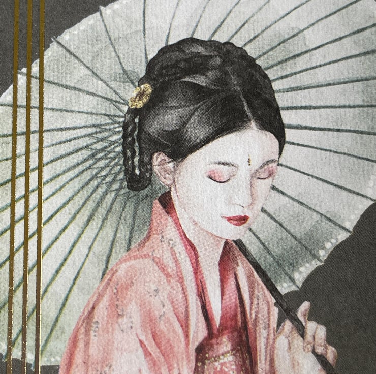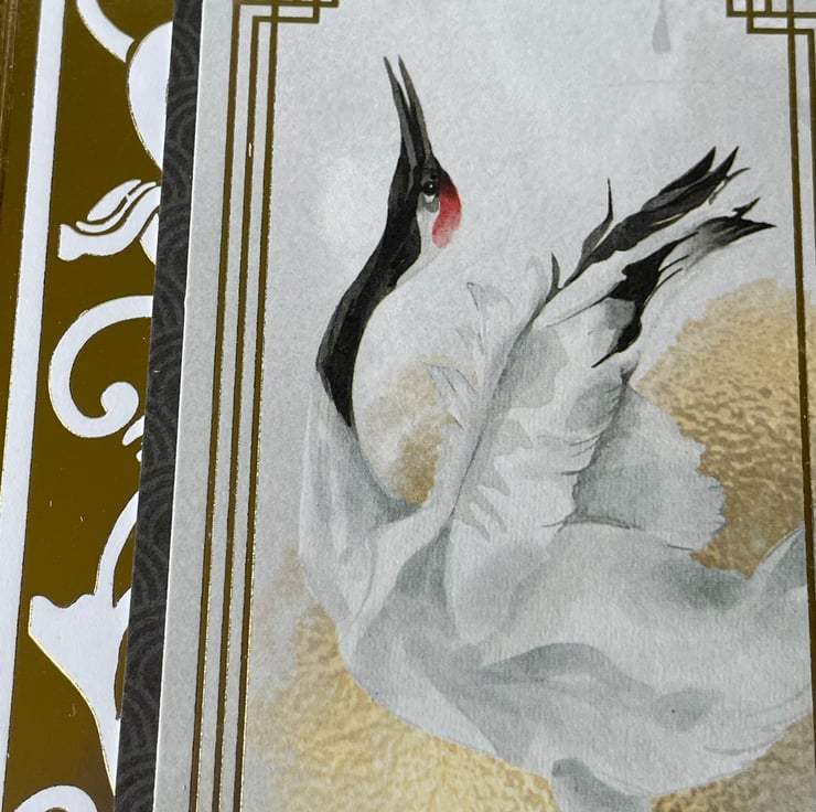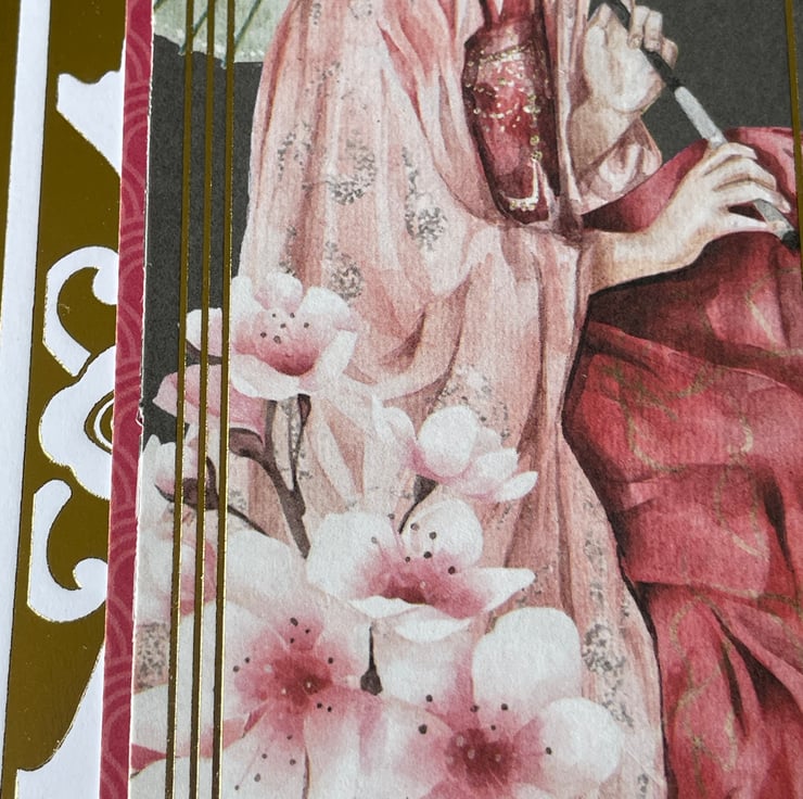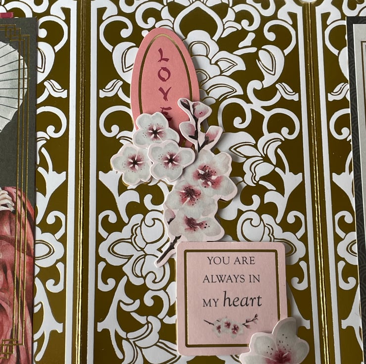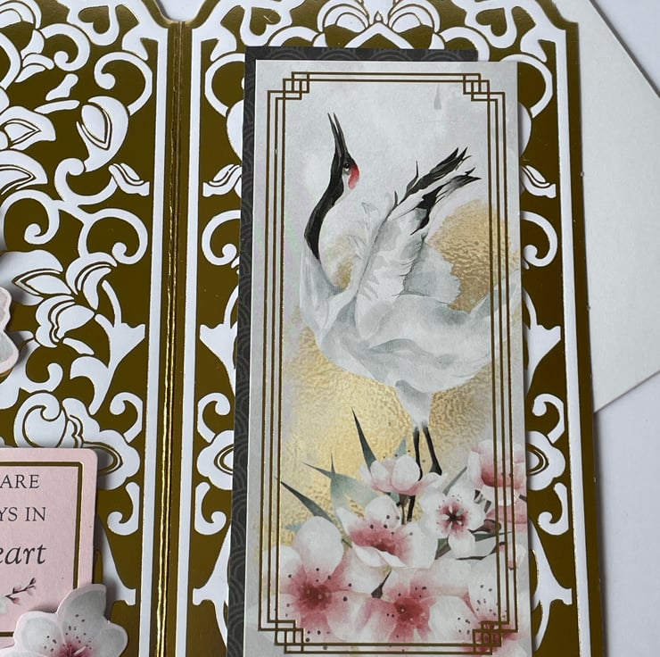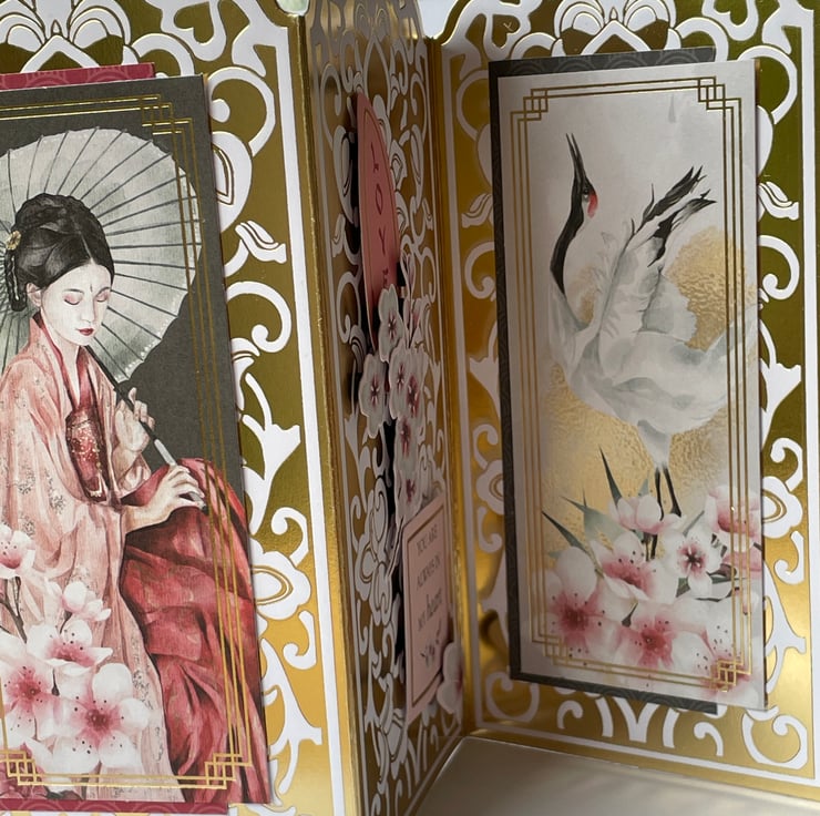 An unusual and unique greetings card. This DL sized card has an unusual design. The base of the card is a white and gold decorated and shaped screen shape. It is embossed and has a lovely texture. This is topped with 3 different designs, the first is of a beautiful and demure Japanese lady sitting holding a parasol. She has a Kimono on and the panel is decorate with cherry blossom. The middle panel is decorated with 2 sentiments, one says love and the other says You are always in my heart. More cherry blossom is decoupaged on to decorate. The third panel has crane with it's wings flexes back sitting on more cherry blossom. A very evocative card for many occasions such as birthday, with love, anniversary and much more.