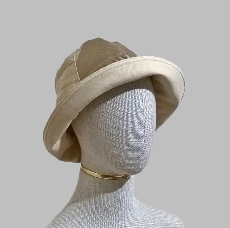 Plastic millinery reed has been added to the brim edge so it will keep it's shape and not flop. This allows the brim to be worn down, or with front or one side rolled up.