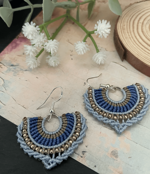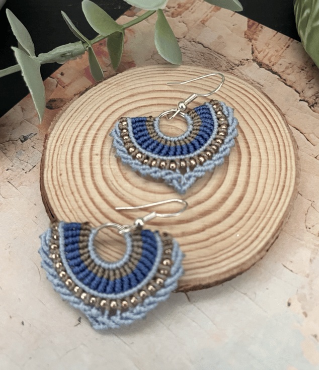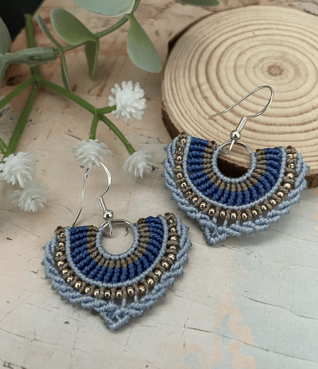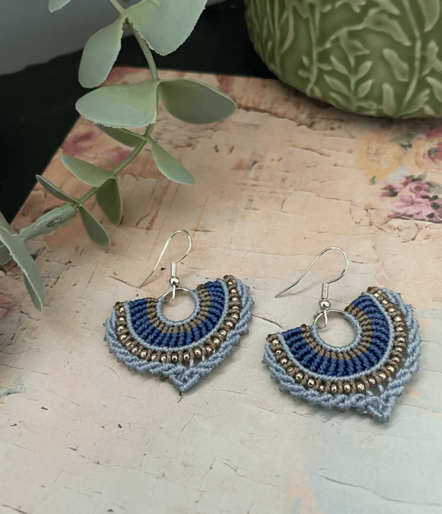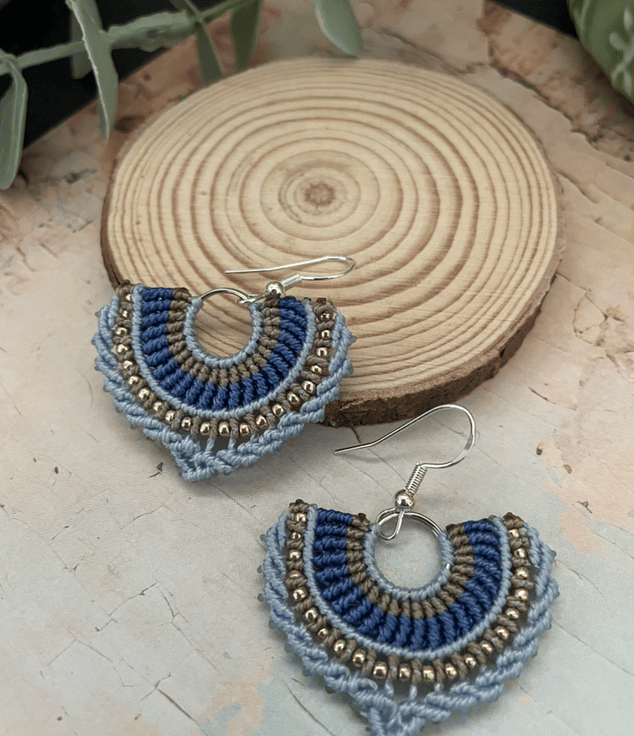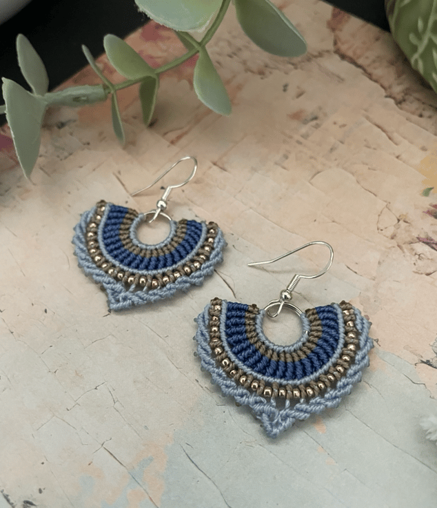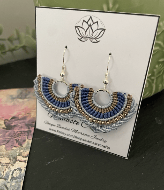 Designed and created by me in my Kent studio in pretty shades of blue and copper interwoven with tiny glass seed beads and using unbreakable c-lon macrame thread which makes them very light weight and easy to wear.
