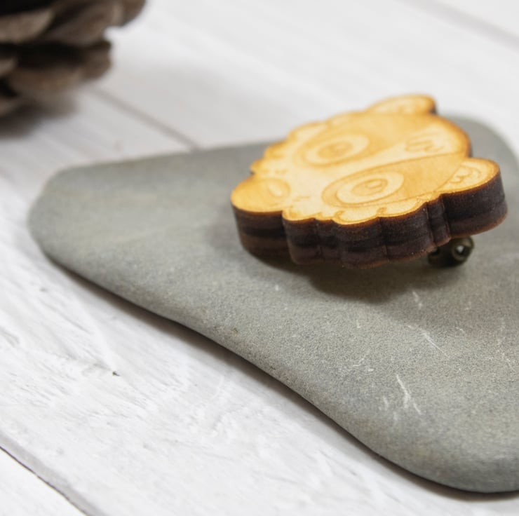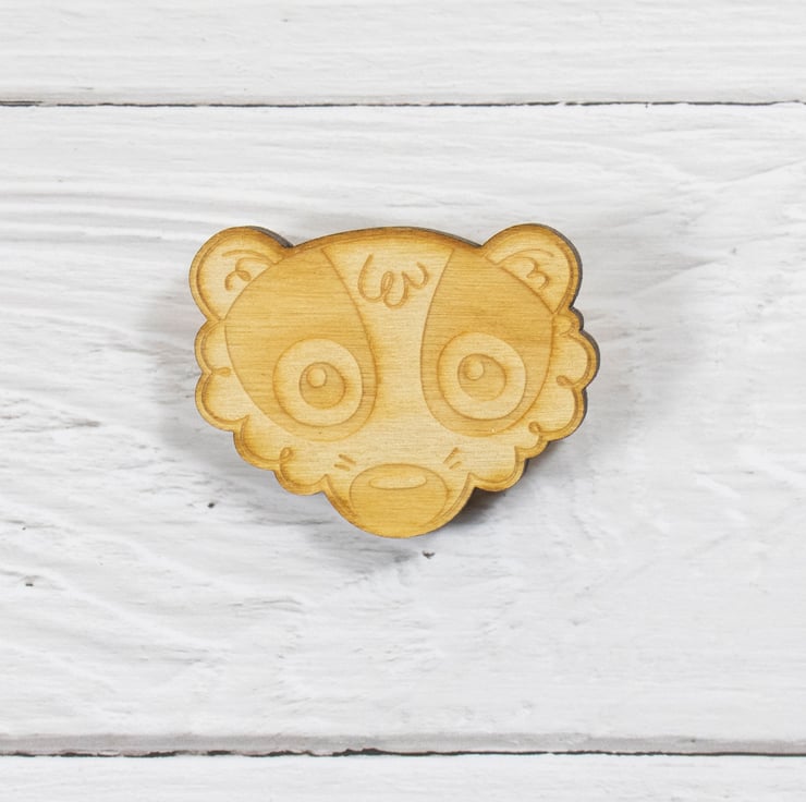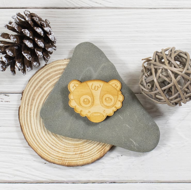 - Wooden badger face brooch