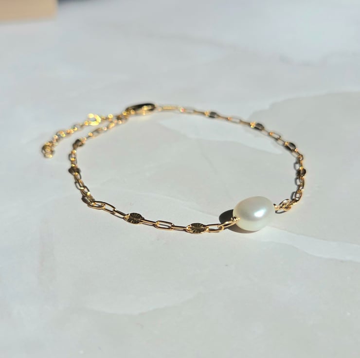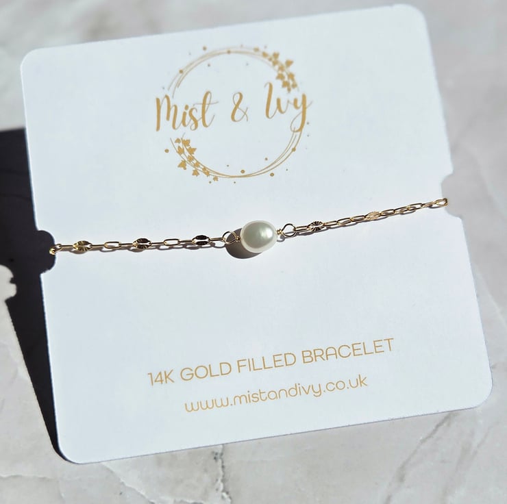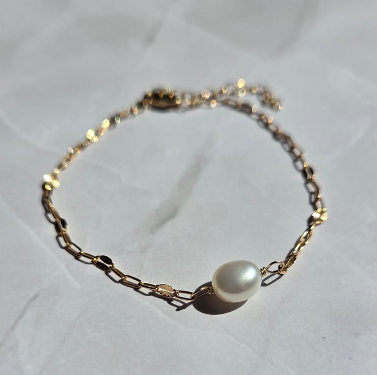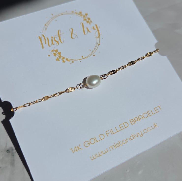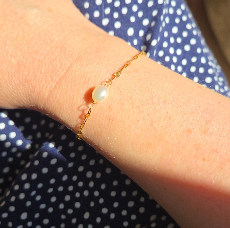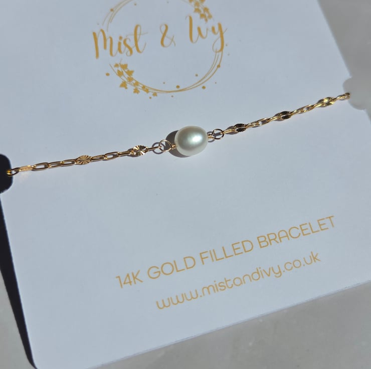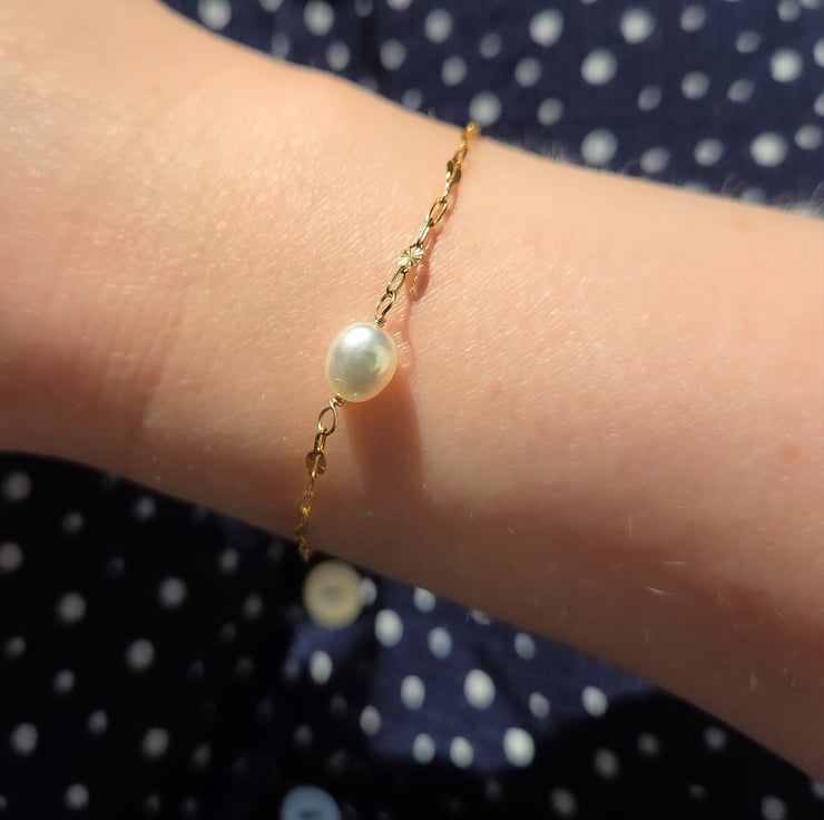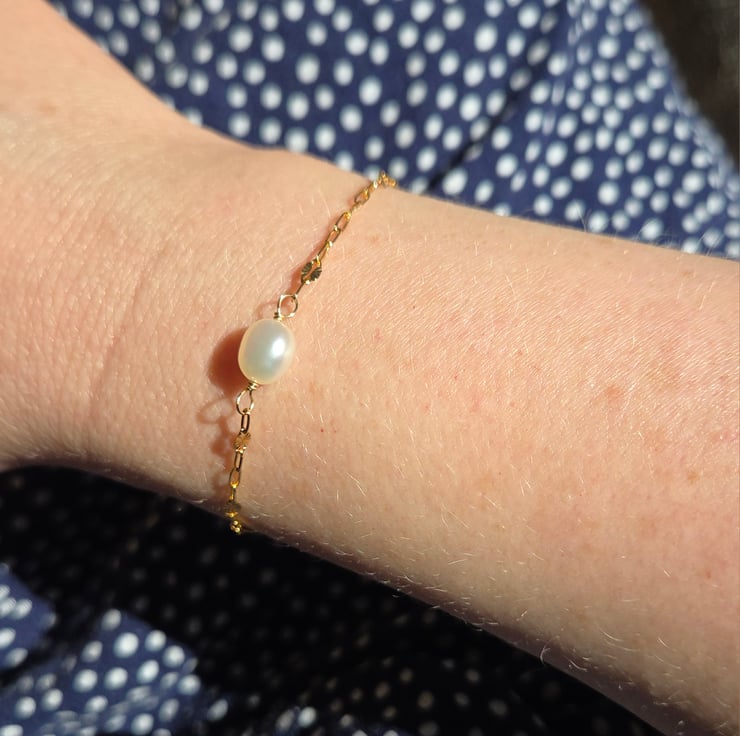 This delicate and elegant gold filled bracelet is handmade with a single freshwater pearl which has been wire wrapped with care onto a beautiful starburst style chain.
