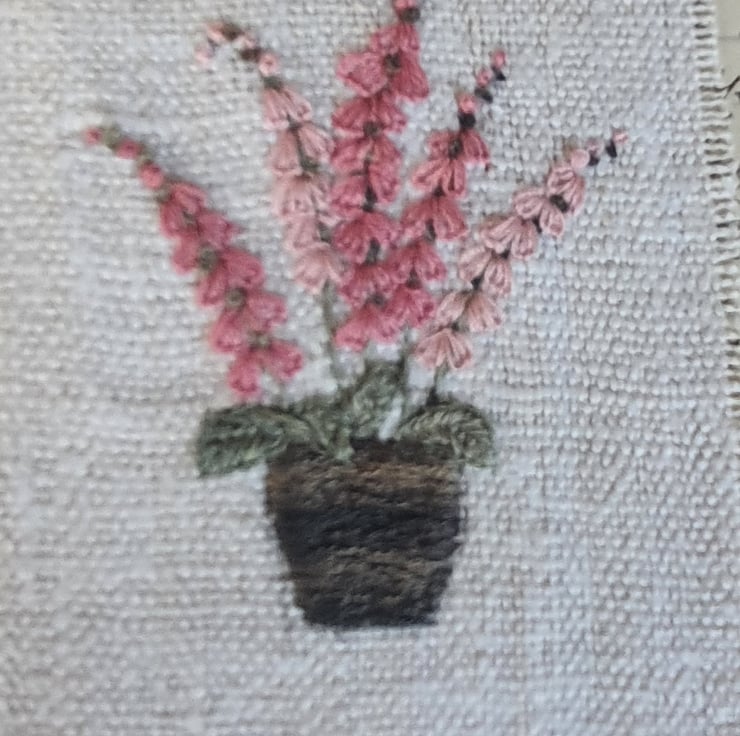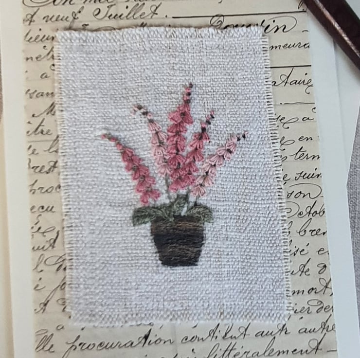 More than a card! Hand embroidered on vintage linen and mounted on a piece of old French manuscript on a blank card for your own message. Ideal for when you want to give more than a card as this beautiful card can be framed afterwards.