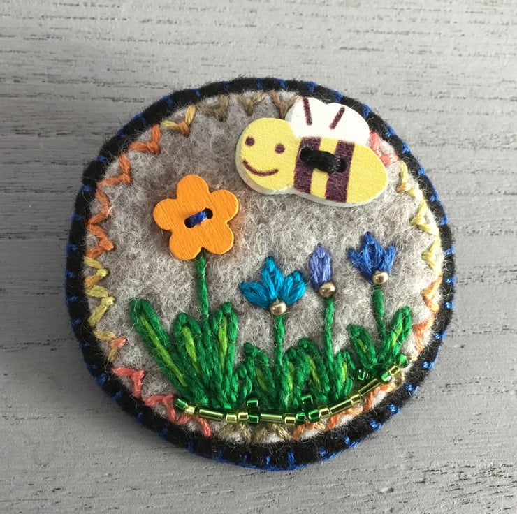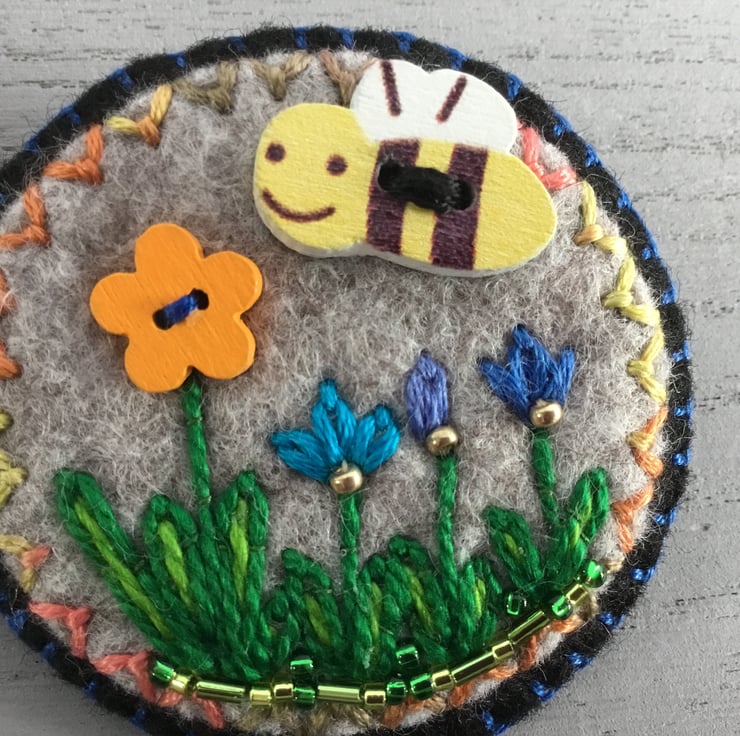 This hand embroidered brooch is a happy brooch sending positive vibes ……A wooden button of a smiling Bee is sewn onto cream wool felt …and is happily buzzing over hand embroidered sapphire blue Flowers and an orange wooden Flower button, decorated with golden and green bugle and seed beads. The black wool felt border is hand embroidered with blue Blanket Stitches, matching the stripes on the Bee button and the blue Flowers.