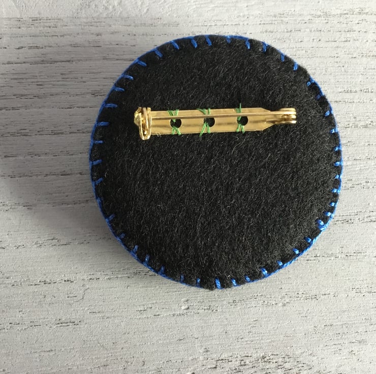 This brooch has a metal bar brooch pin, with a safety catch, for secure wear, sewn on the back. It’s 2 inches (5 cms) in diameter…..a nice wearable size.