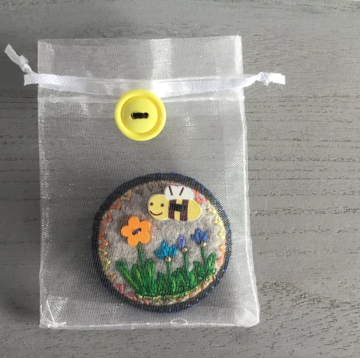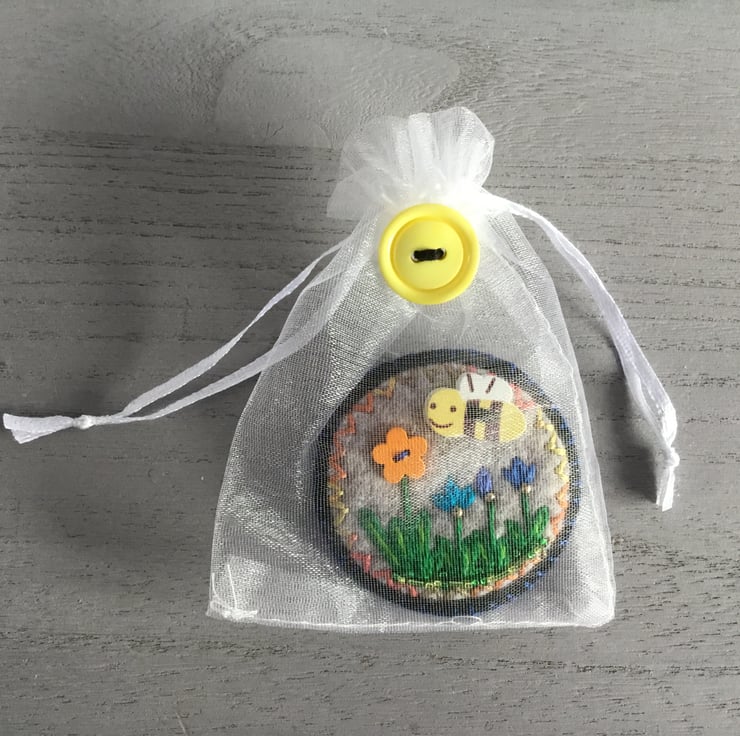 This Hand Embroidered Bee - Happy Brooch is gift wrapped in an organza bag decorated with a yellow button. A ideal birthday, friendship, thank you or Christmas gift….or to treat yourself….