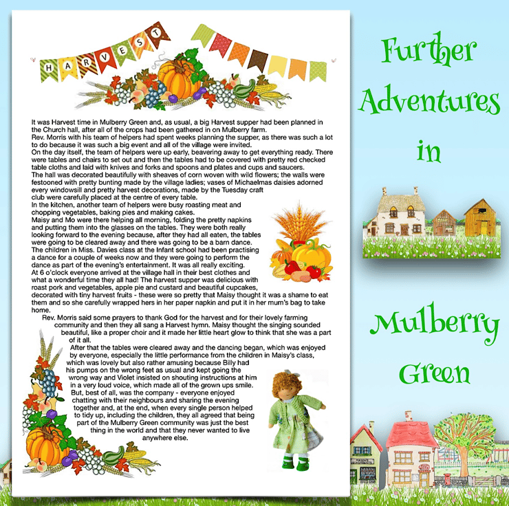 There are other children in Maisy’s class at school - Violet, Billy with his pet rabbit, Amber, Tilly, Rosie and her kittens, Amelia, Ruby, Marigold, Bobby with Max the dog, and the twins Oliver and Olivia, who have a puppy called Oscar. The dolls are all 26cm tall and baby Daisy is 16cm. Maisy and Mo love nothing more than having adventures with their friends. You can read about their adventures on my Facebook and Instagram pages - Maisy Muffin Rag Dolls and on my Mulberry Green Pinterest boards.