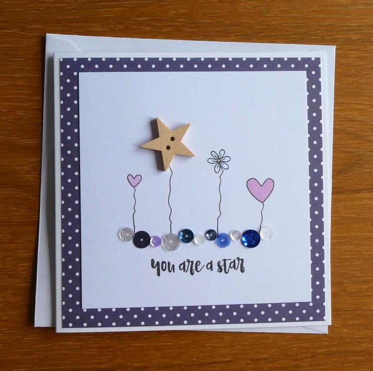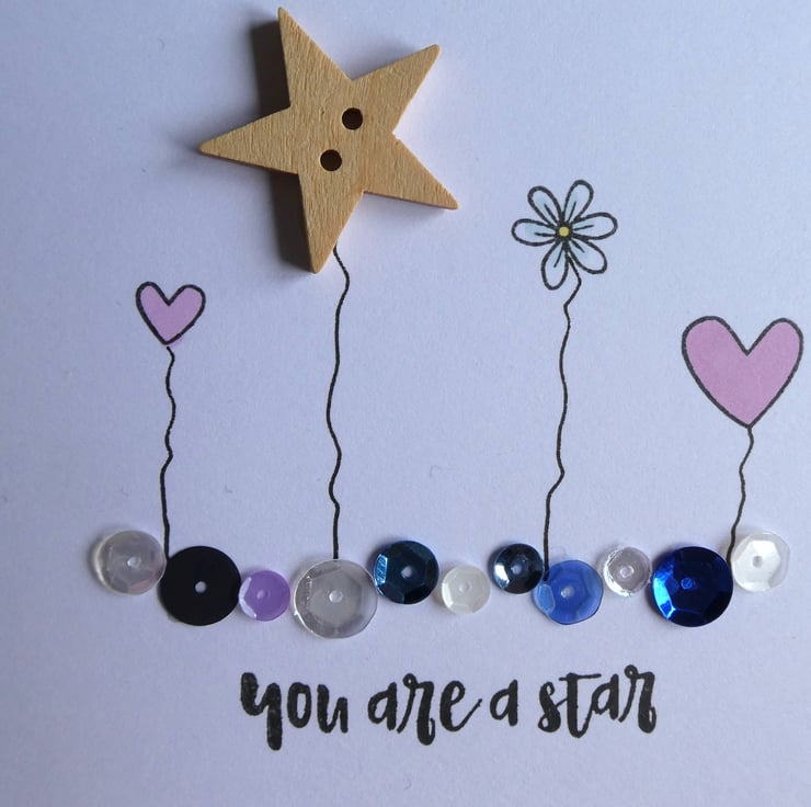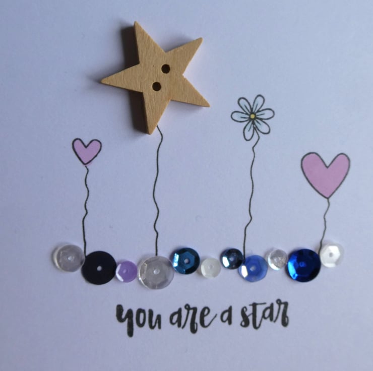 With a star shaped wooden button in a row of hearts and flowers in soft pastel colours, sitting above a line of pastel and silver sequins and the message You Are A Star this card could be sent as a congratulations card, a thank you card or just to let someone know that you are thinking of them.