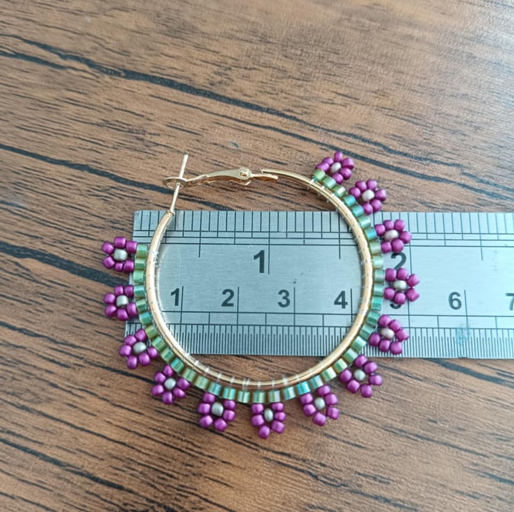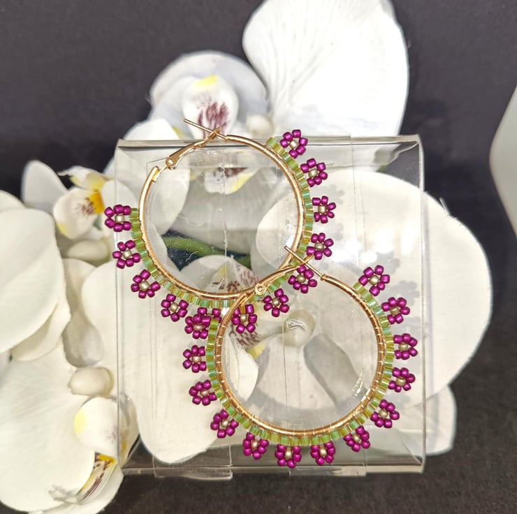 Floral Beaded Hoop Earrings  - Handmade Beadwork on Stainless Steel Hoops