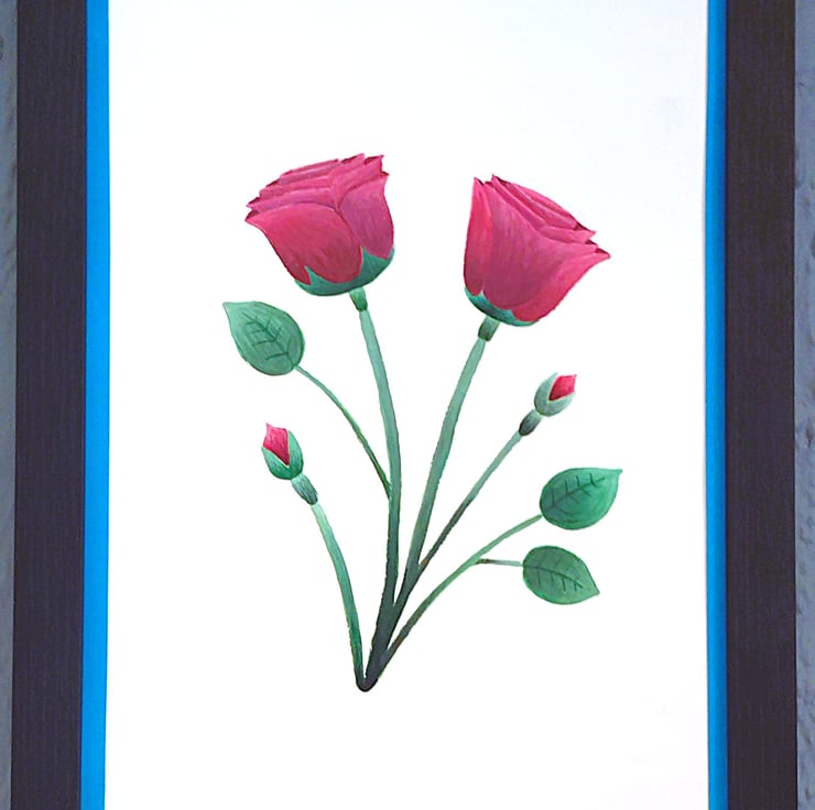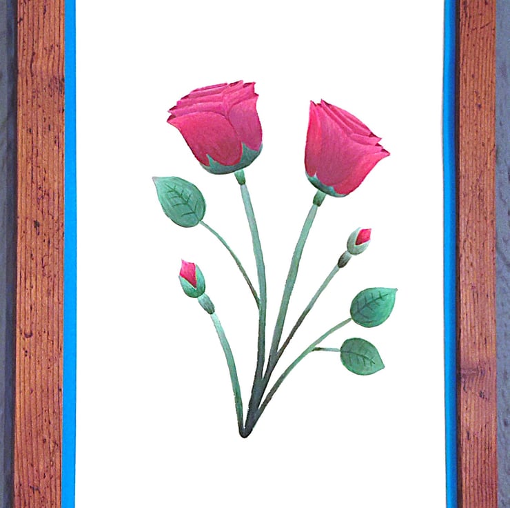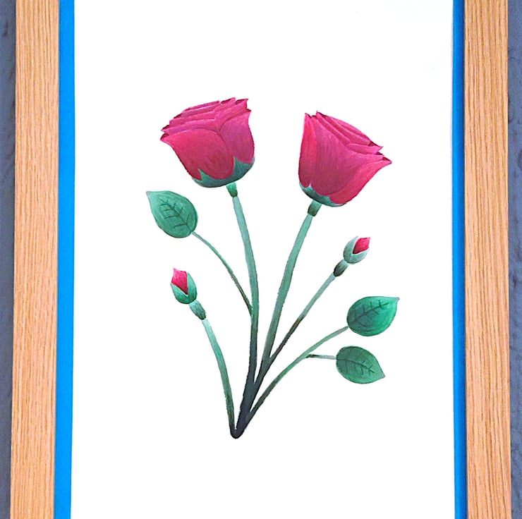 This is a framed high-quality coloured A3 print of a painting of red roses on a white background with a hard backing. The print comes finished with a contemporary, stylish dark blue border. Framed with an expensive Styrene Protective Perspex (which has same clarity of glass) ready to hang. Choose from three different types of frame; black, oak or dark oak(see images). Colours of print and border may differ slightly due to computer/phone settings. All purchases delivered within 7-10 working days.