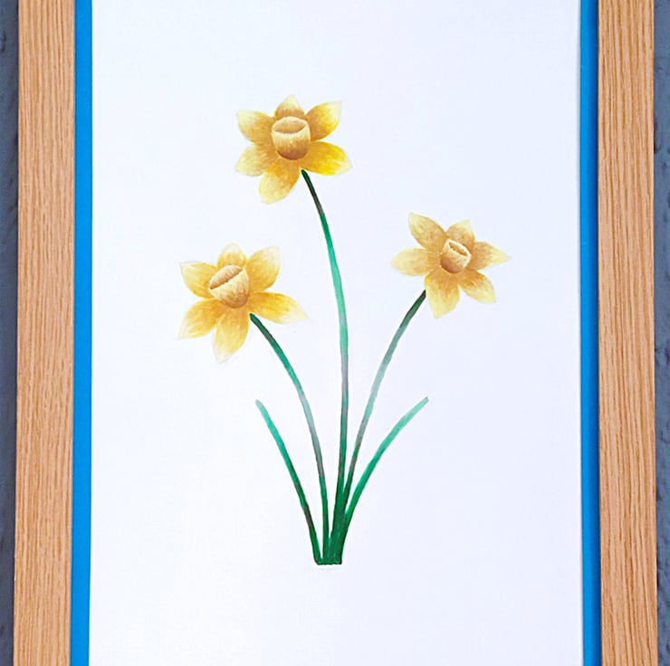 Framed high-quality coloured A3 print of my painting of yellow daffodils on a white background with a hard backing. The print comes finished with a vibrant, stylish dark blue border. Framed with an expensive Styrene Protective Perspex (which has same clarity of glass) ready to hang. Choose from three different types of frame; black, oak or dark oak(see images). Colours of print and border may differ slightly due to computer/phone settings. All purchases delivered within 7-10 working days.