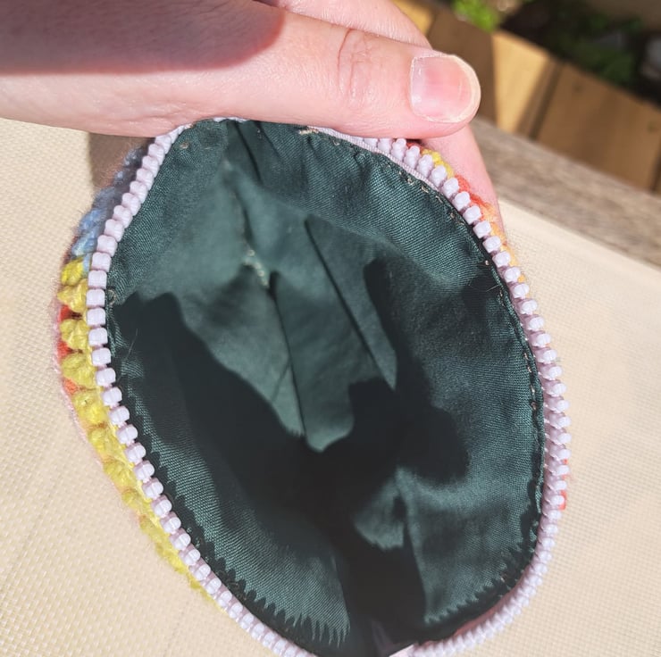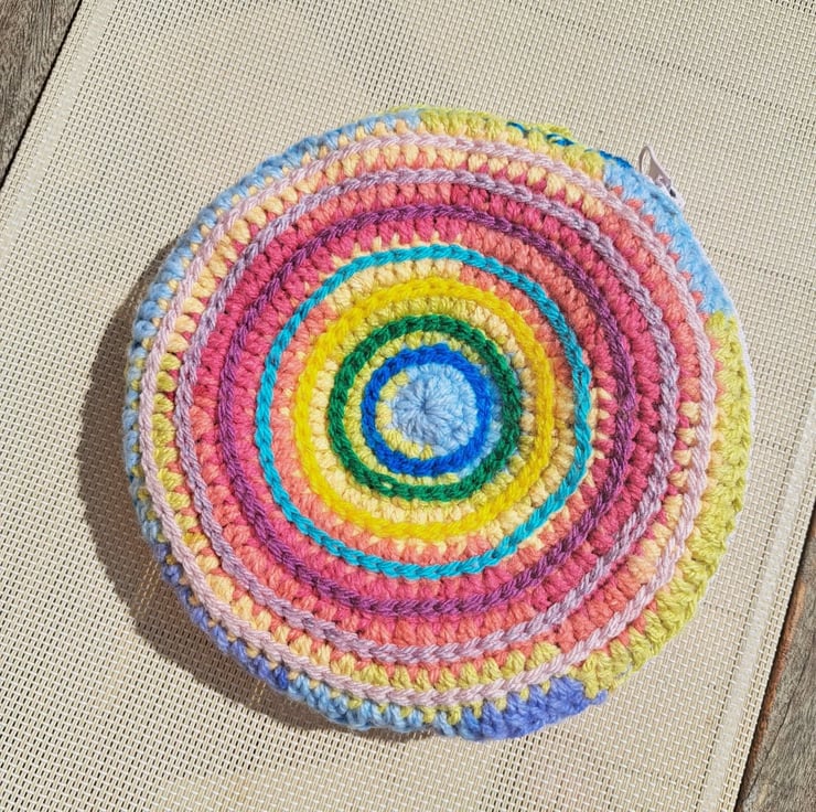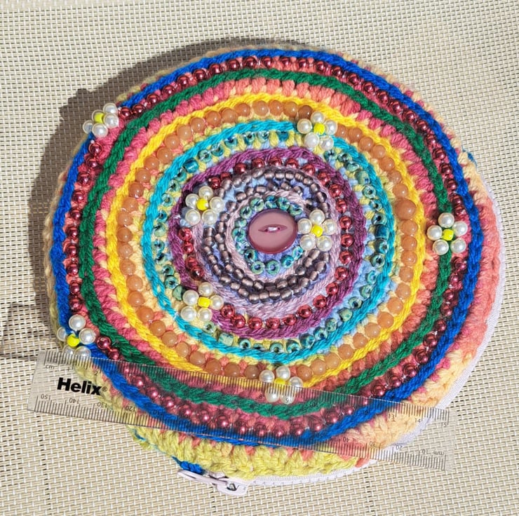 Colourful rainbow crochet purse with added embroidery, beads and lots of Jade gemstones. Some of the beads made into daisies. Zip closure, lined. Keep dry and away from velcro