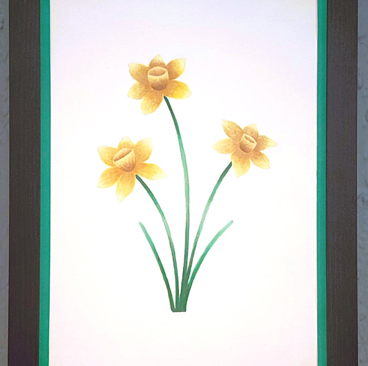 Framed high-quality coloured A3 print of my painting of yellow daffodils on a white background with a hard backing. The print comes finished with a vibrant, stylish dark green border. Framed with an expensive Styrene Protective Perspex (which has same clarity of glass) ready to hang. Choose from three different types of frame; black, oak or dark oak(see images). Colours of print and border may differ slightly due to computer/phone settings. All purchases delivered within 7-10 working days.
