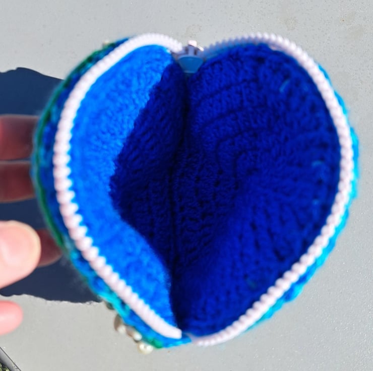 Ocean inspired Crochet purse with real shells, gemstones, beads and embroidery. Zip closure
