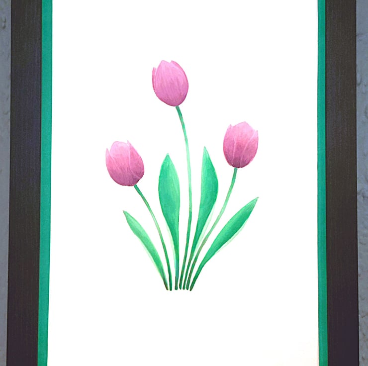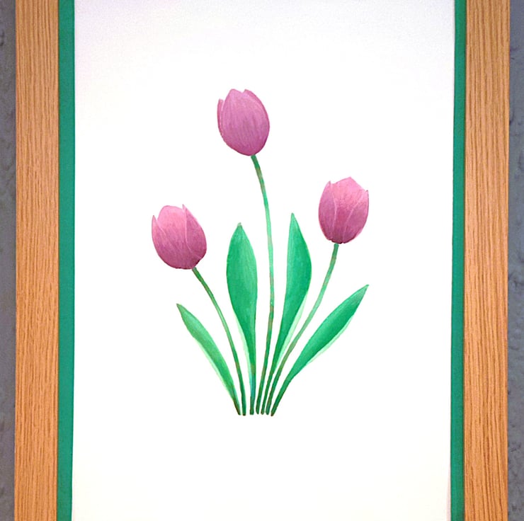 Framed high-quality coloured A3 print of my painting of purple tullips on a white background with a hard backing. The print comes finished with a dark green border. Framed with an expensive Styrene Protective Perspex (which has same clarity of glass) ready to hang. Choose from three different types of frame; black, oak or dark oak(see images). Colours of print and border may differ slightly due to computer/phone settings. All purchases delivered within 7-10 working days.