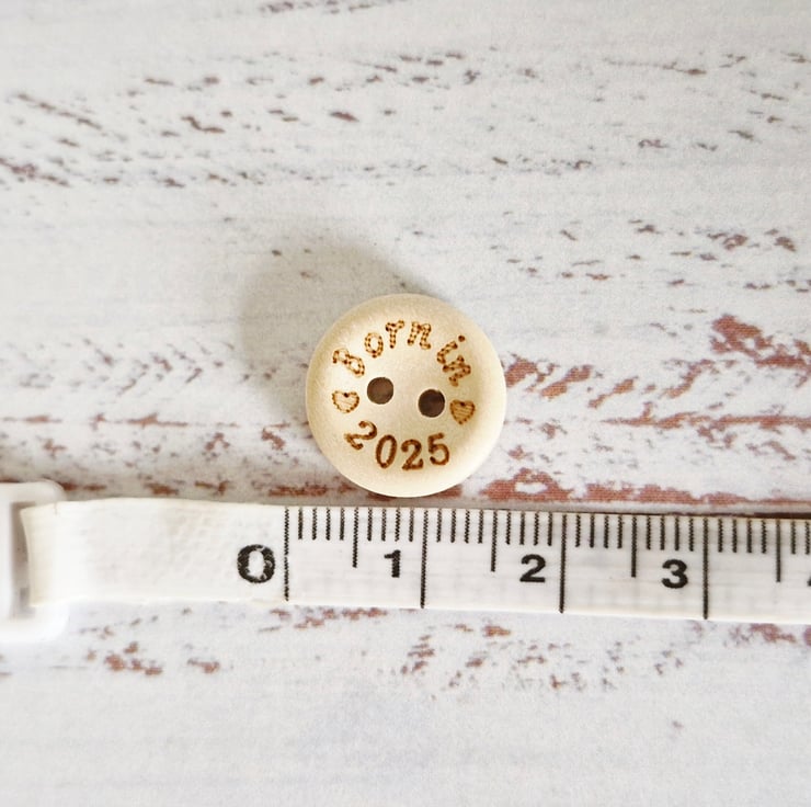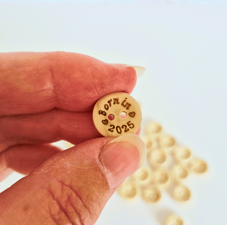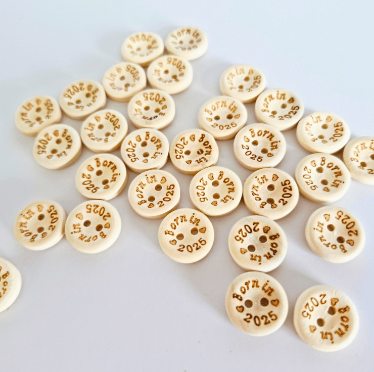 Add a finishing touch to your handmade baby items with these natural wooden buttons, printed with Born in 2025. Measuring 15mm across, they’re the perfect size for booties, cardigans, keepsake toys, or memory blankets — especially for newborns arriving in the year 2025.
