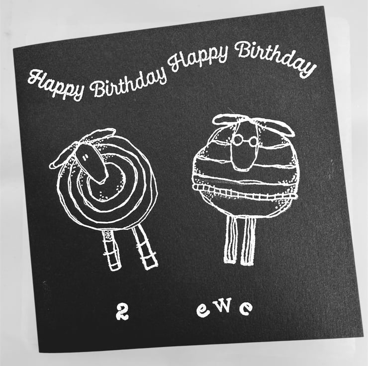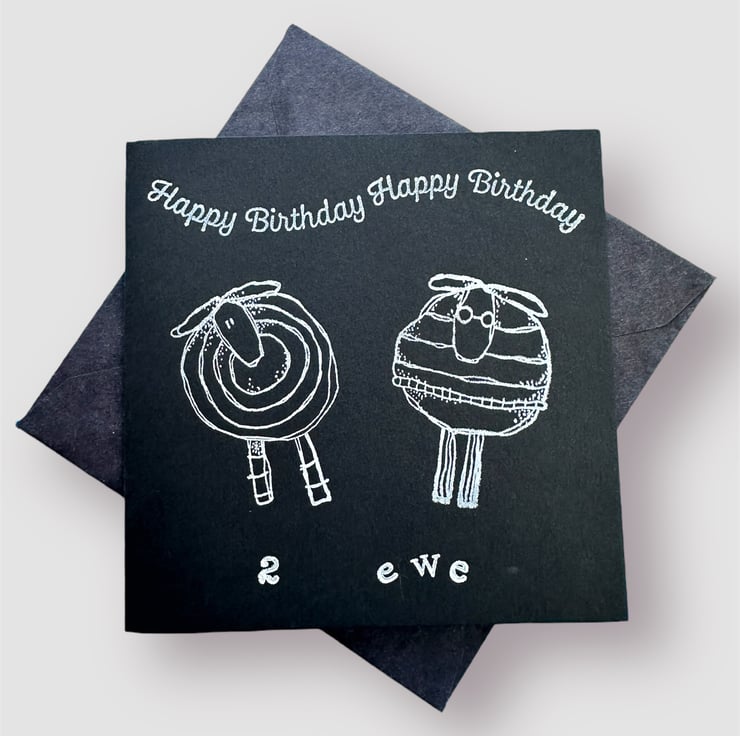 An extra special large square card with 2 cute funny cartoon sheep with the text “Happy Birthday 2 ewe” on a very heavy, quality black card stock and insert.