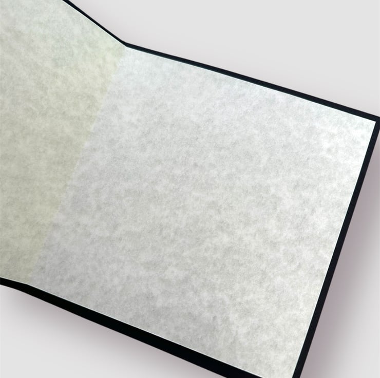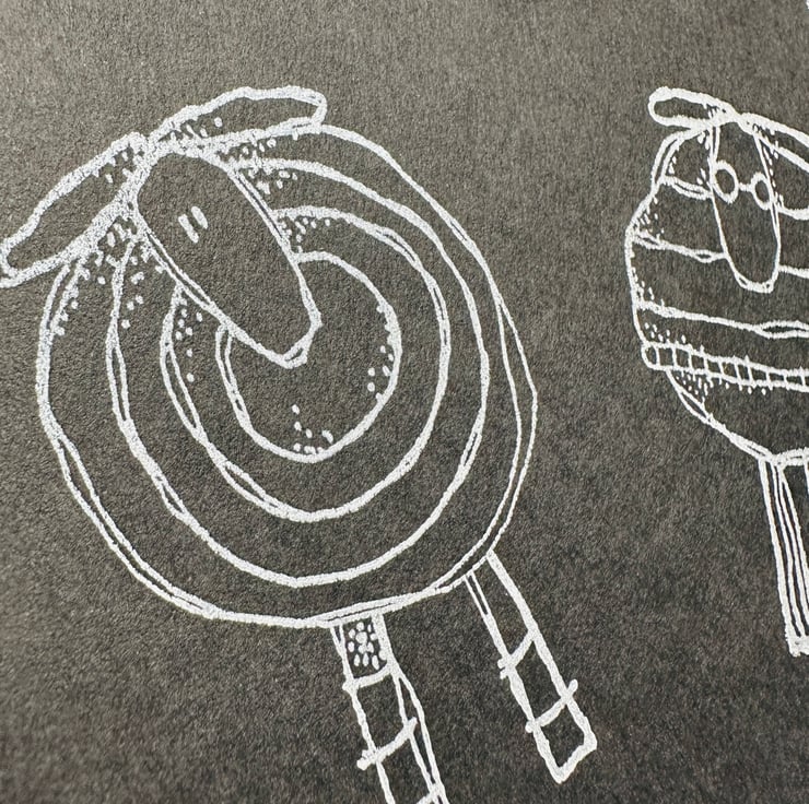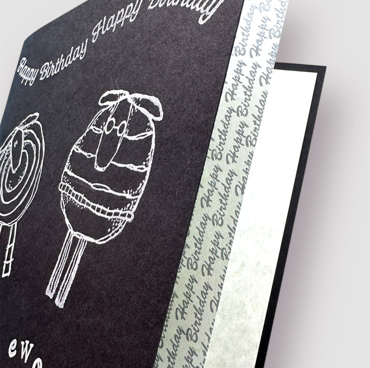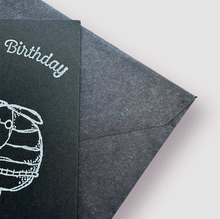 Hand printed using a pearlescent white archival ink with the luxury touch of a parchment light card insert with “Happy Birthday” printed in shiny silver text on a choice of either a white or cream background on one side and plain on the other for you to write your own message.