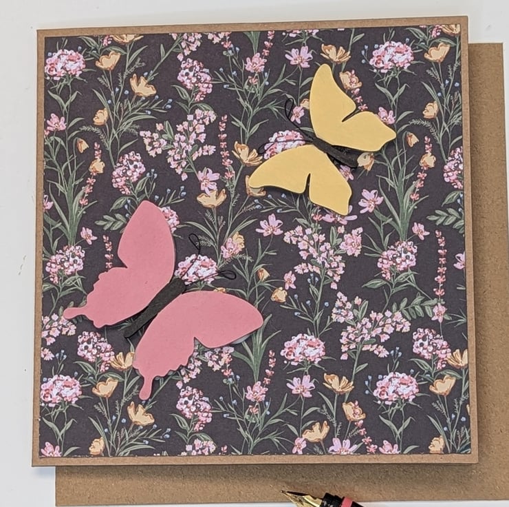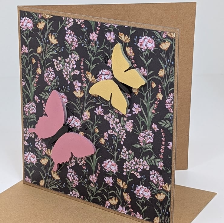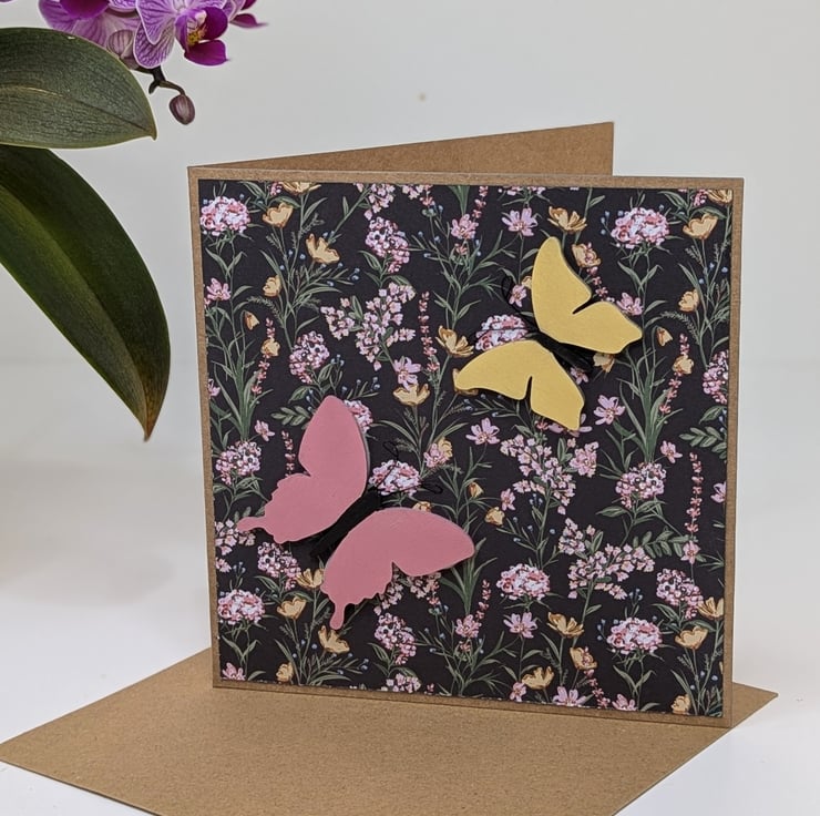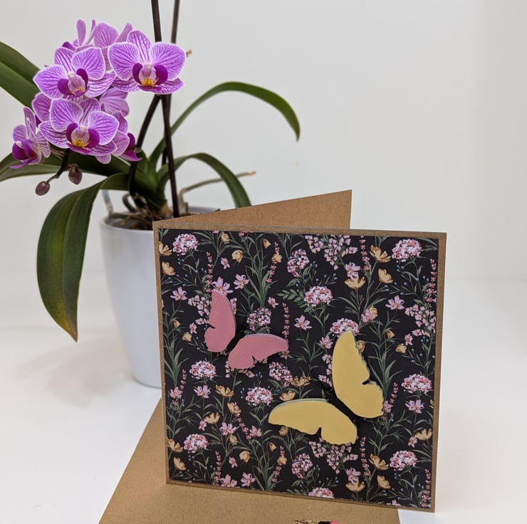 Decorative handmade greetings card layered with pretty floral paper and two hand painted yellow and pink wooden butterfly embellishments which complement the paper design. The butterflies' antennas have been handcrafted from black jewellery wire and the butterflies have been firmly attached to the card with glue. This sturdy card has been left blank inside for your own message making it suitable for many occasions especially a Birthday, Mother's Day, thank you, get well soon, thinking of you, etc. This thick square card is buff coloured and comes with a matching envelope. The back of the card has a Crafty Nature label. The card will come supplied in a protective cellaphane bag inside a postage box so it does not get bent.