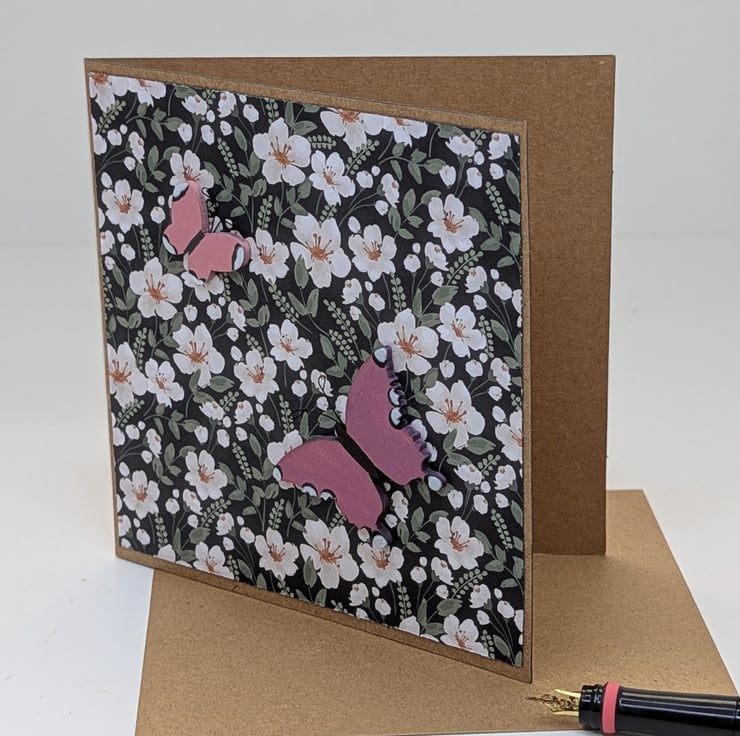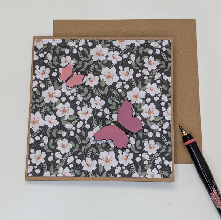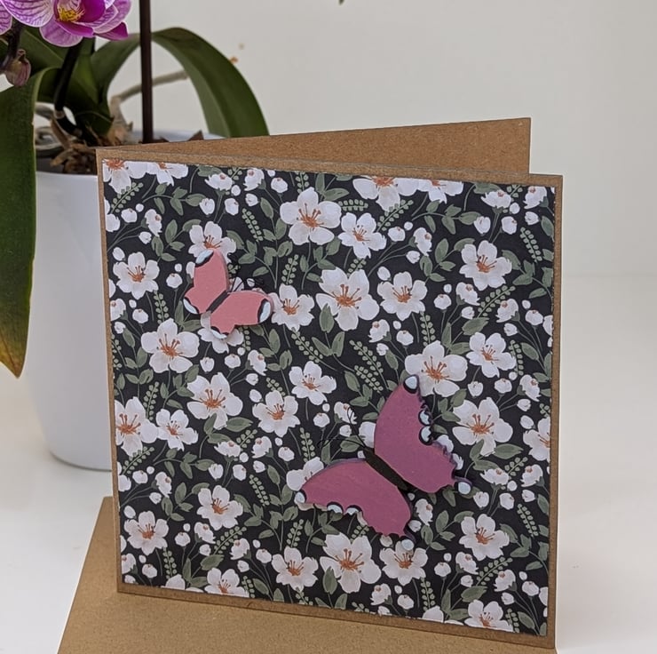 Pretty blank card suitable for any occasion which has been layered with decorative floral paper and two hand painted pink, white and black wooden butterfly embellishments which complement the paper design. The antenna of the butterflies have been handcrafted from black jewellery wire and the butterflies have been attached firmly to the card with glue. This lovely card has been left blank inside for your own message making it suitable for many occasions especially a Birthday, Mother's Day, thank you, get well soon, thinking of you, etc. This thick square card is buff coloured and comes with a matching envelope. The back of the card has a Crafty Nature label. The card will come supplied in a protective cellaphane bag inside a postage box so it does not get bent.