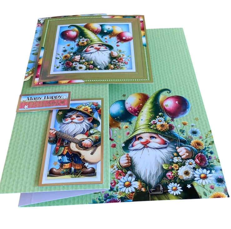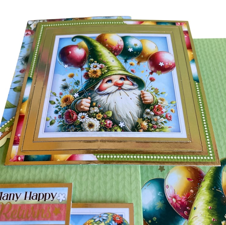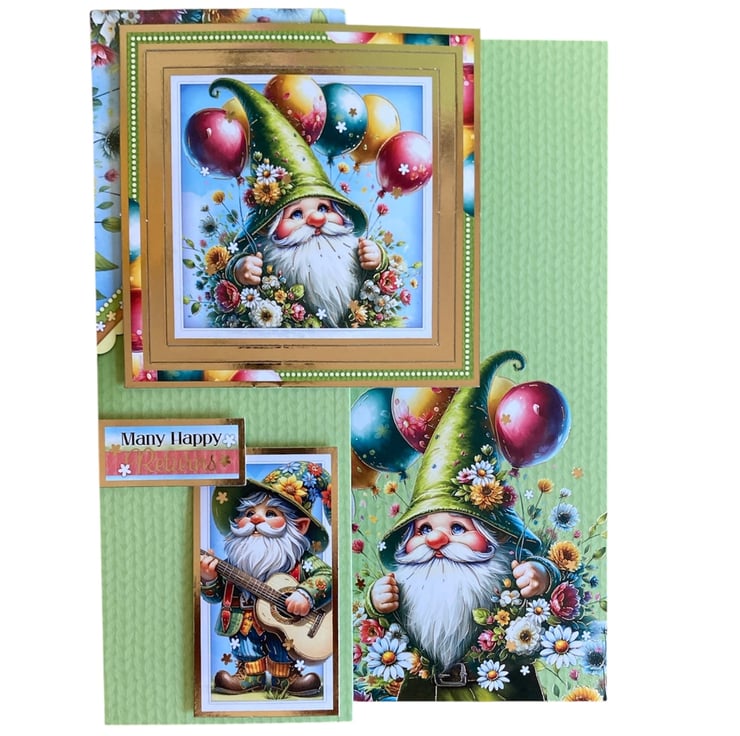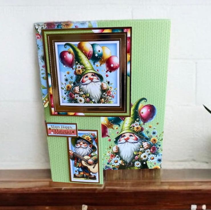 This zigzag card features cheerful and bright images of a gnome dressed in green holding balloons and flowers. Gold foiled toppers have been added in 3D, one featuring a gnome playing a guitar another with the words Many Happy Returns.