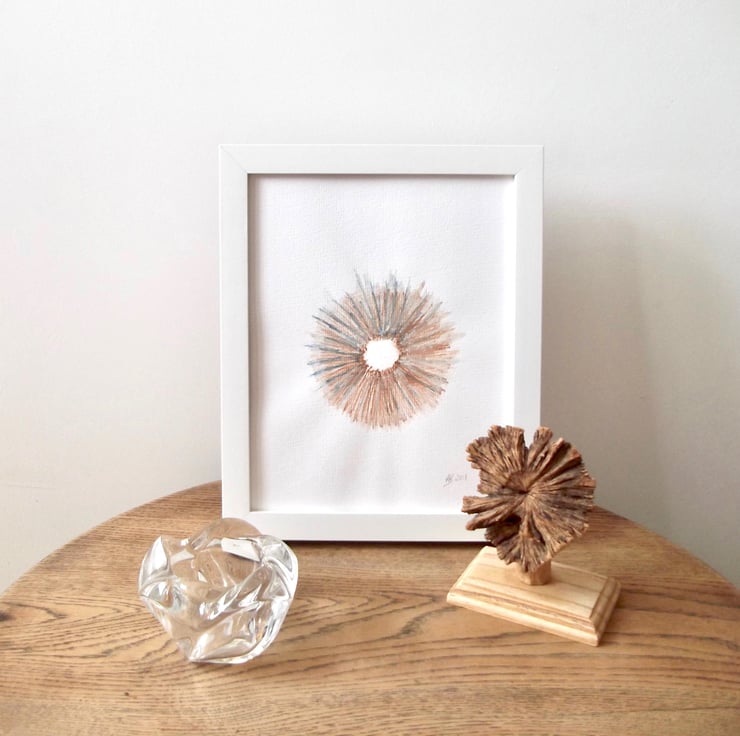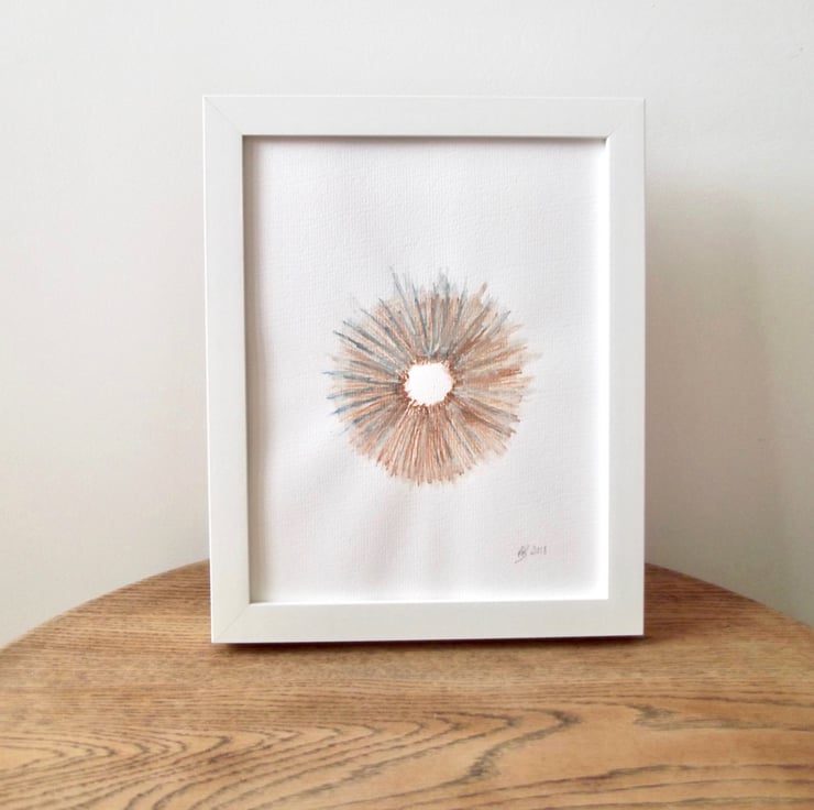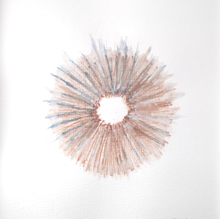 This watercolour pencil abstract ring design features warm brown and classic blue flecks, created on watercolour paper.