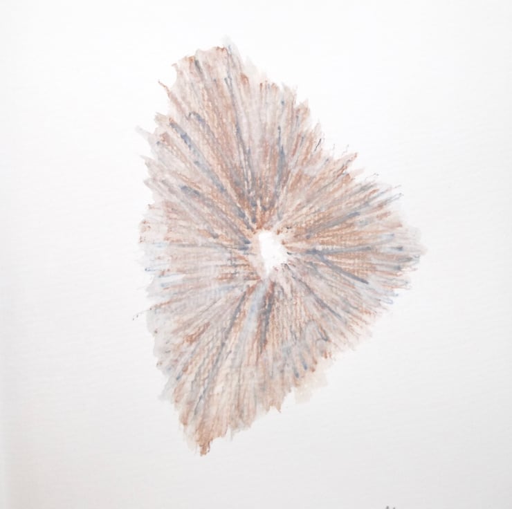 This watercolour pencil abstract ring design features warm brown and classic blue flecks, executed on watercolour paper.