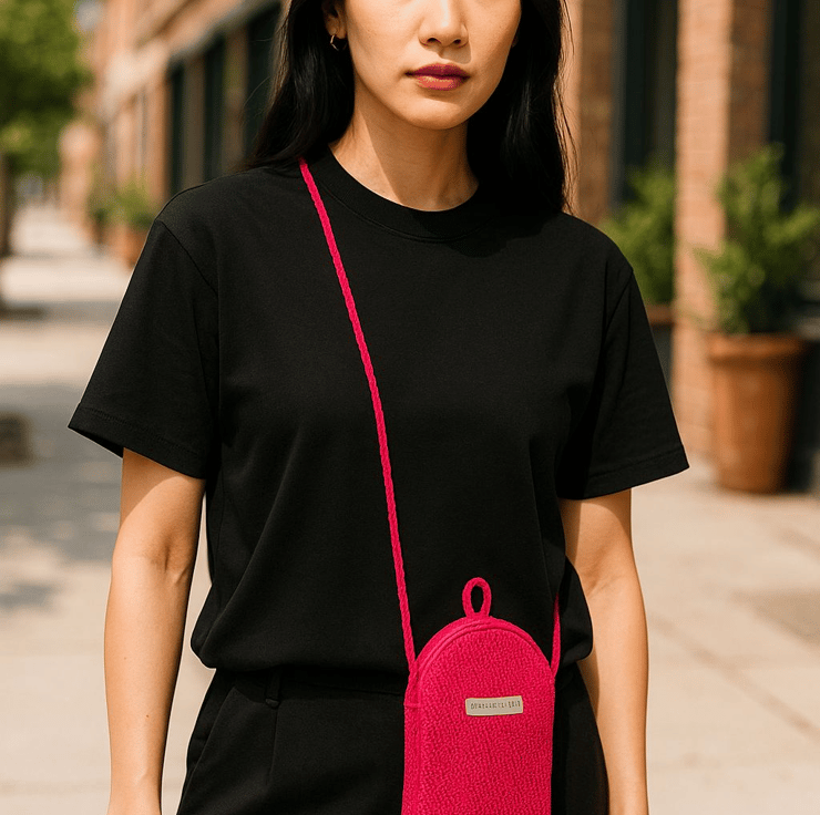 Handmade modern mobile phone bag with a credit card pocket. Bright red colour with black dots.