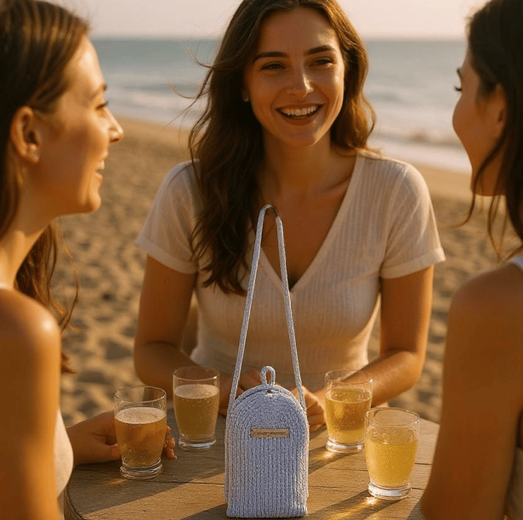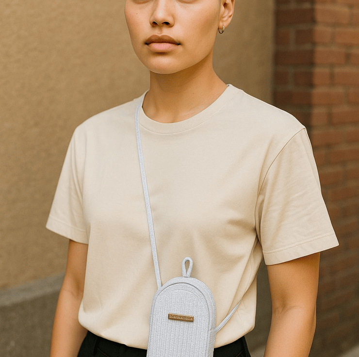 Handmade modern mobile phone bag with a credit card pocket. Light grey bluish colour.