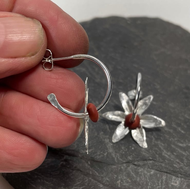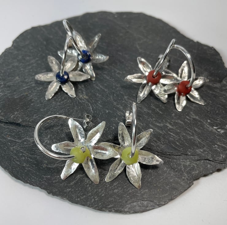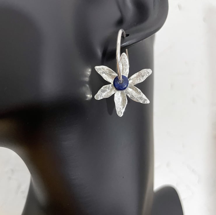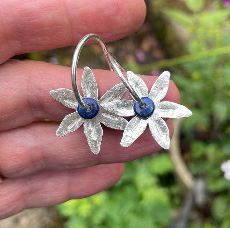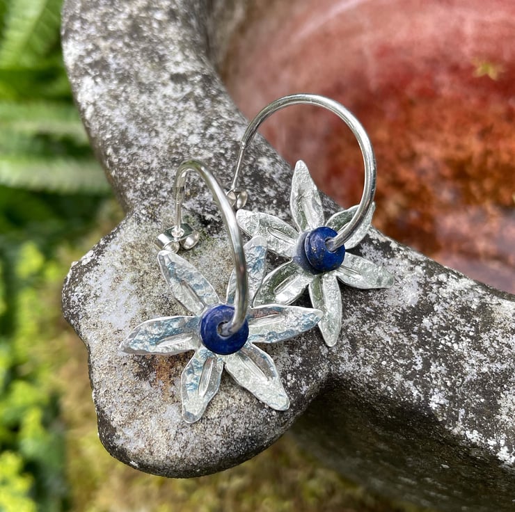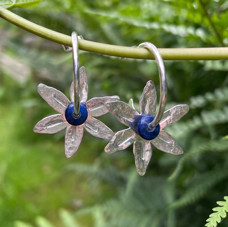 Silver flower shapes have been cut from sheet, then textured with hammers and punches. These thread straight onto hoop stud earrings, along with small dark blue semi precious beads.