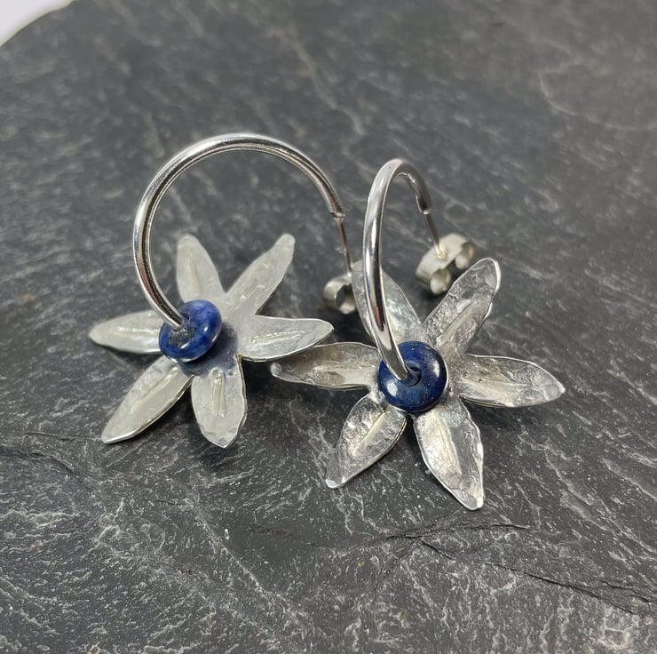 Sterling silver flower hoop earrings with navy blue lapis stone centres.