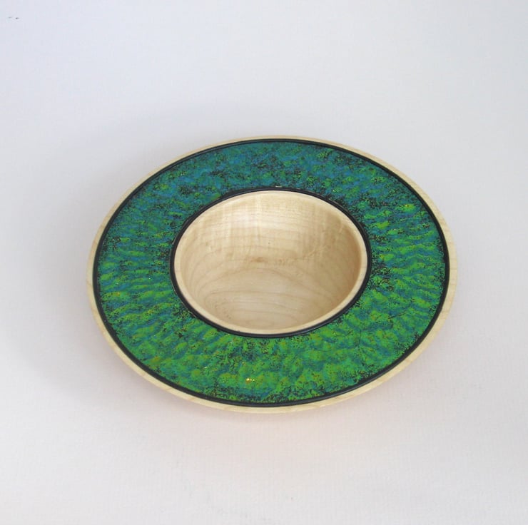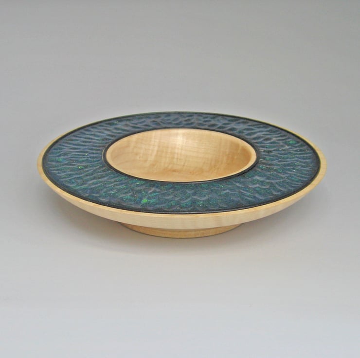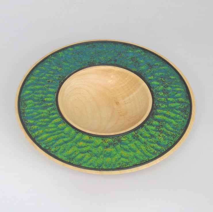 A pretty platter turned in sycamore. The rim was carved before applying flakes that give an interesting iridescent finish over which a durable lacquer was applied. Black Leather lines have been inset into the edge of the bowl.