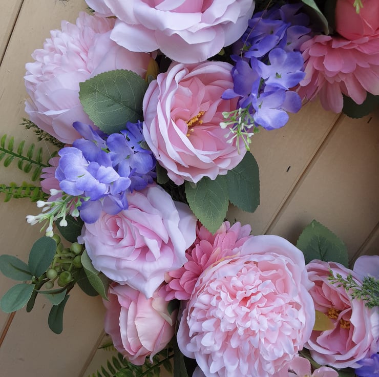 40cm full wreath pink roses,peonies daisies, cherry blossom, purple wisteria, green berries and foliage.
