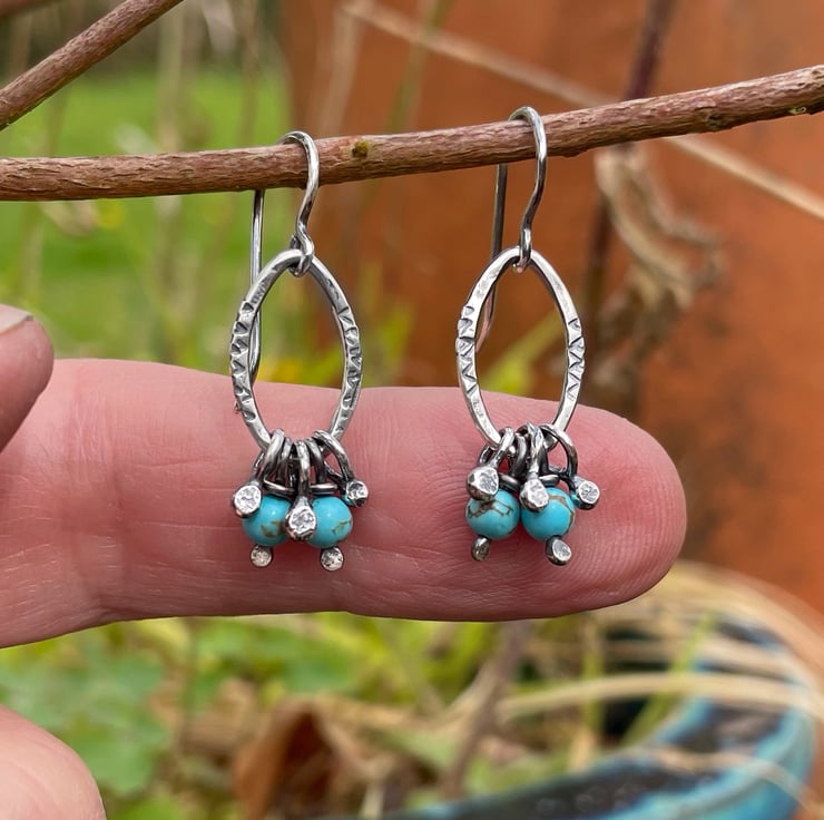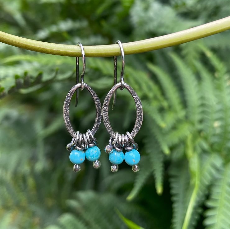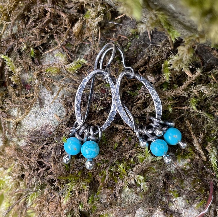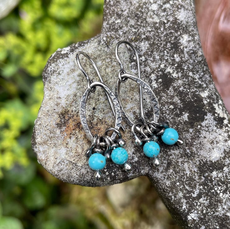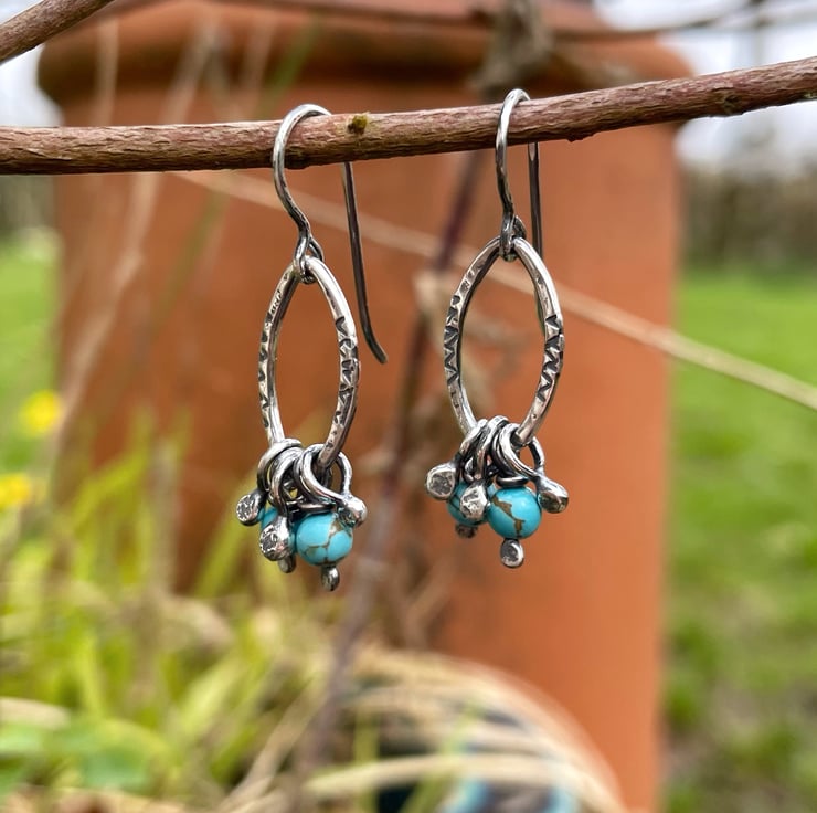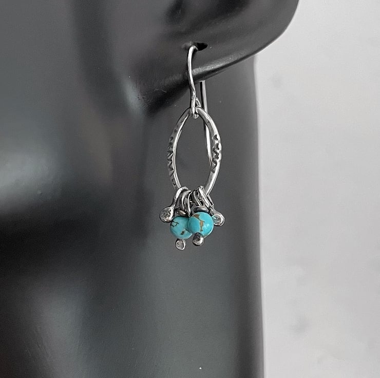 Textured, patterned silver oval links have 5 little handmade dangles, 2 of which have 4mm round turquenite beads on.