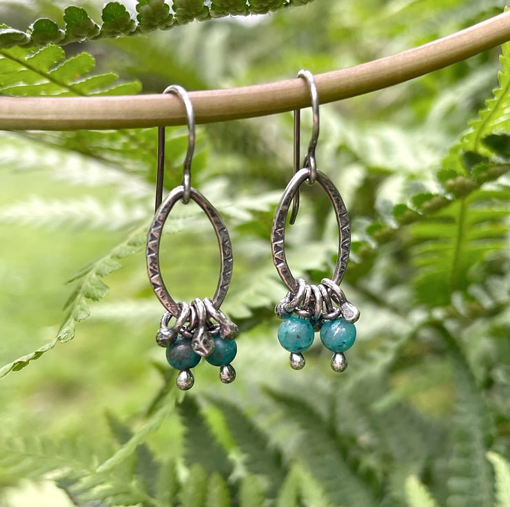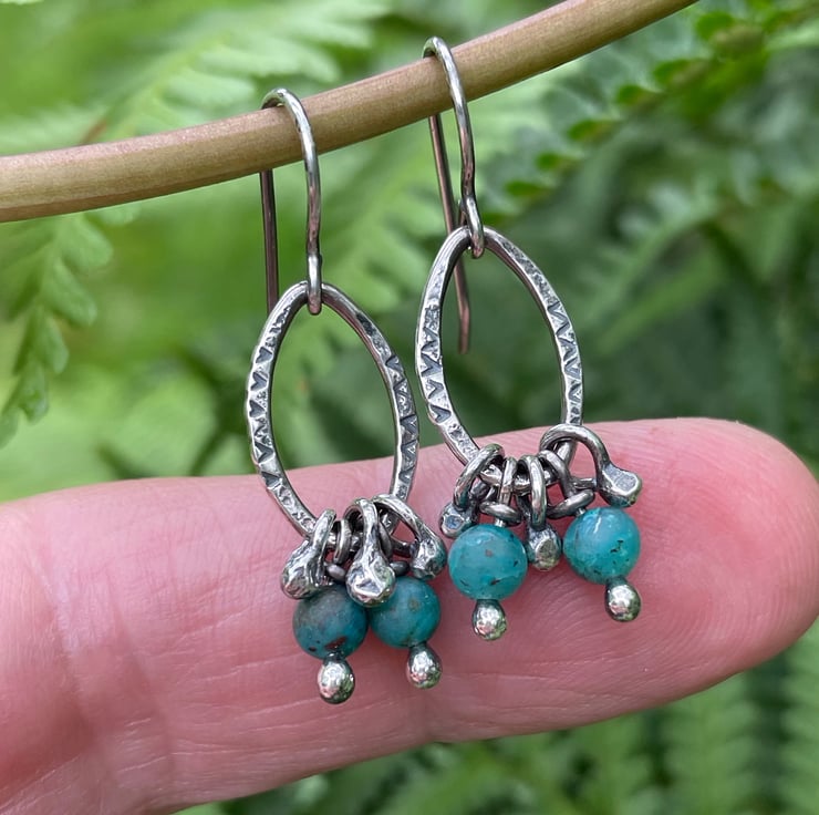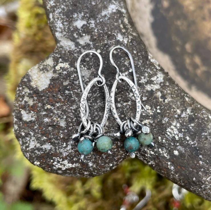 Textured, patterned silver oval links have 5 little handmade dangles, 2 of which have 4mm round cupric chrysocolla beads on.